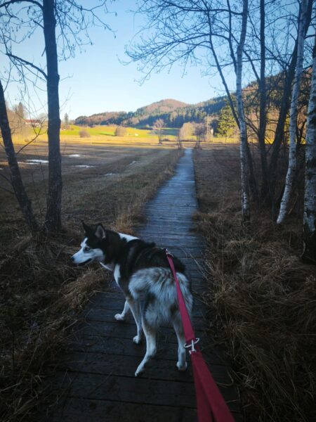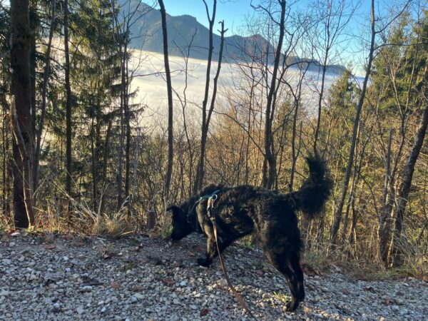 Jeanne und Lucky 2.0 sind so lange den Hochgern hoch gelaufen, bis sie über dem Nebel und in der Sonne waren. Da sie nicht die einzigen Hunde und Menschen mit dieser Idee waren, war ganz viel los und es gab mega viel zu schnüffeln. Lucky war glücklich! 🙂