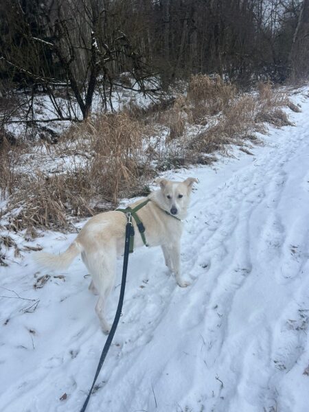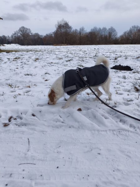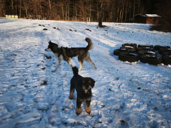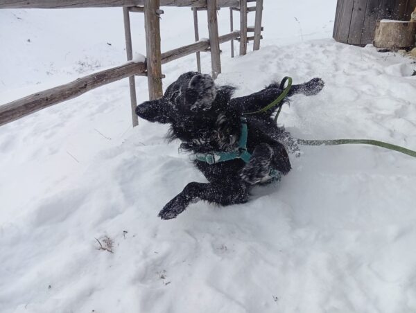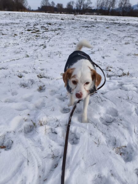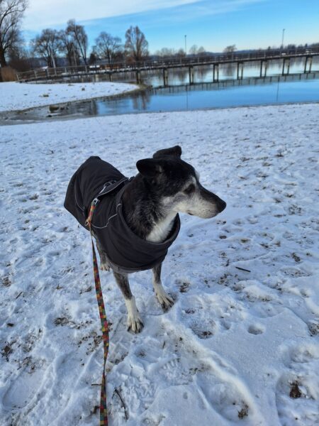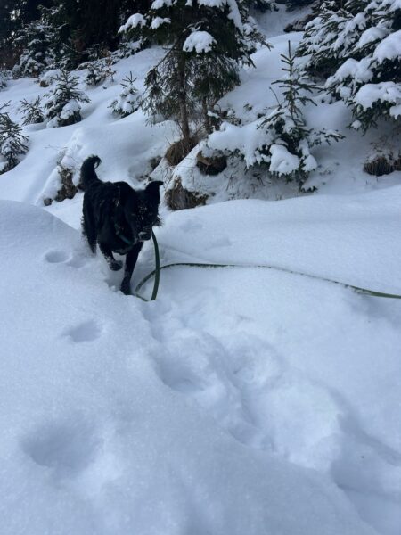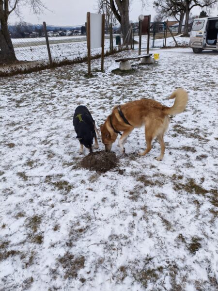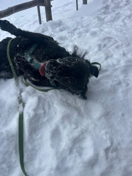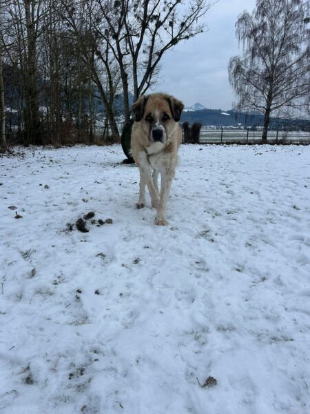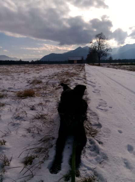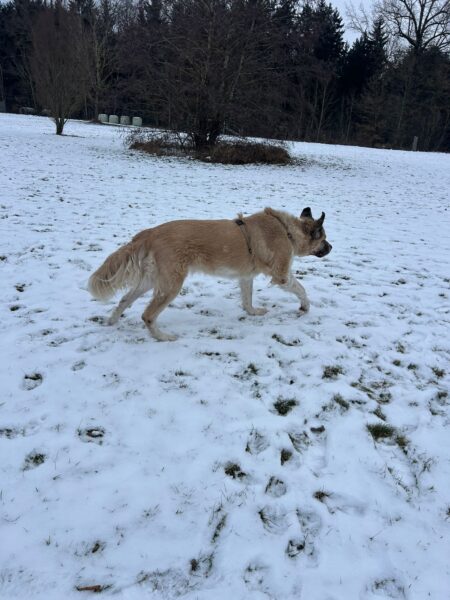 Santana freute sich riesig, Kerstin schon in der Früh zu sehen und mit ihr raus zu dürfen. Die beiden waren auf der großen Wiese und beim kleinen See dahinter, wo Santana vielen Spuren im Schnee nachschnüffelte und immer weider gerne zum Kuscheln stehen blieb. Natürlich gab es auch ein paar Leckerlies zu finden und so kam er entspannt und zufrieden zurück ins TierHeim, wo schon sein Frühstück bereit stand. 🙂