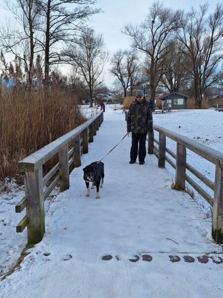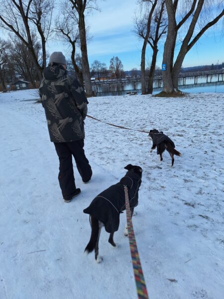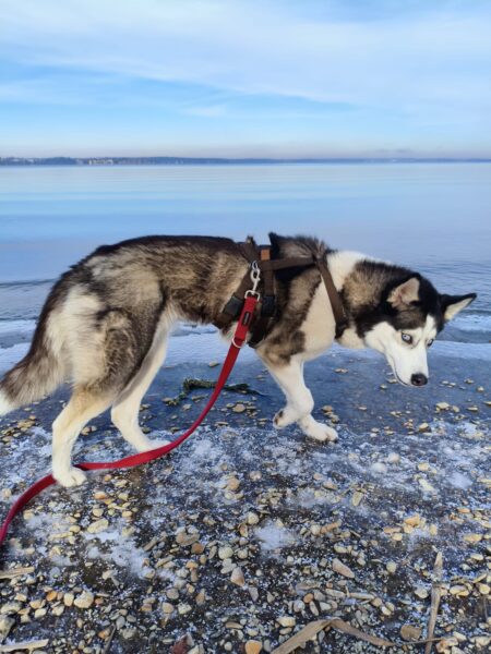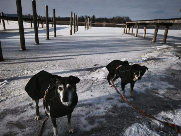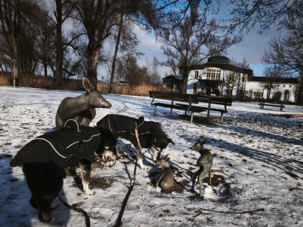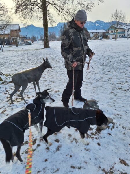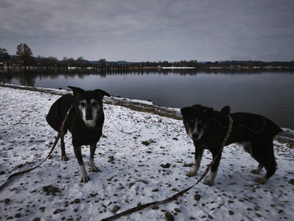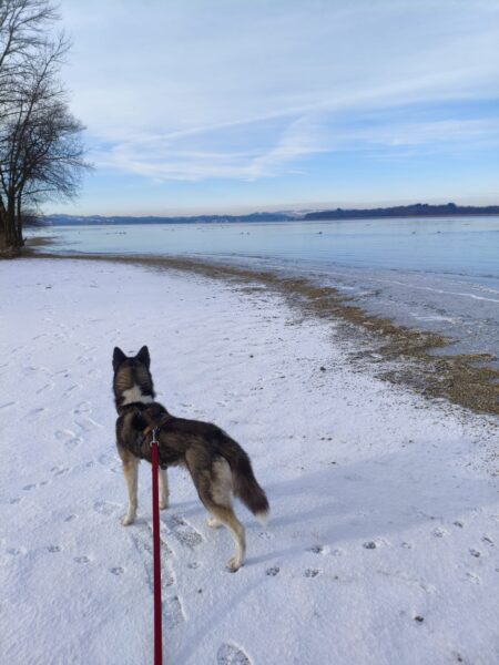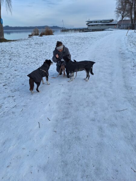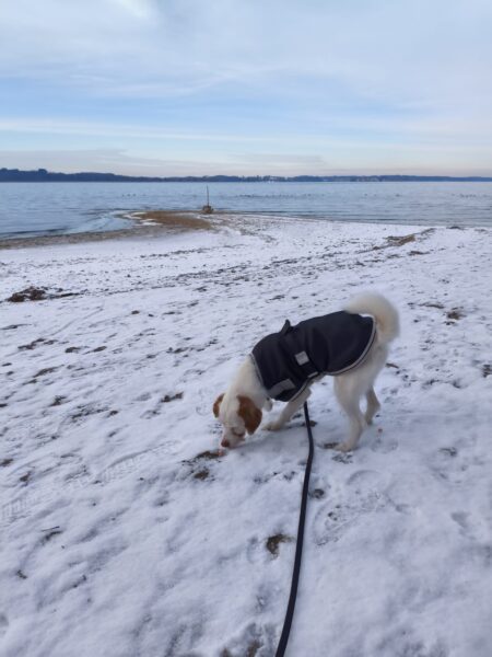 Mit Resi und Franzi fuhr Carsten zum Medical Park, wo die drei einen schönen Spaziergang machten. Am Ufer waren die Mädels erstaunt, kein Wasser, nur Eis! 🙂 Sie hatten trotzdem viel Spaß, schnüffelten ausgiebig am Strand und über die Parkanlage und freuten sich über eine Leckerliesuche bei den Rehen. 🙂