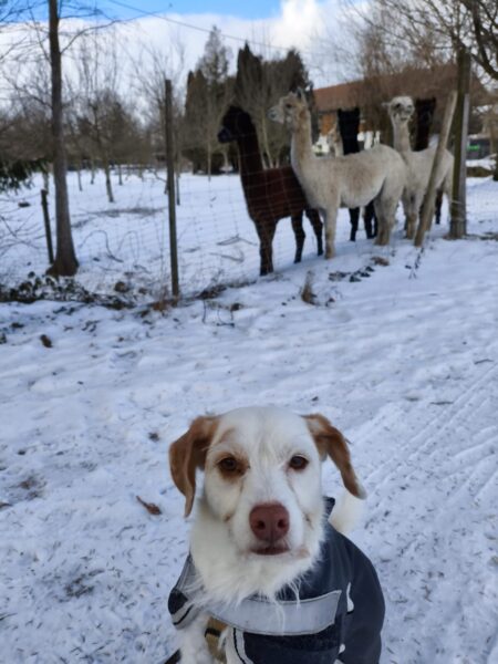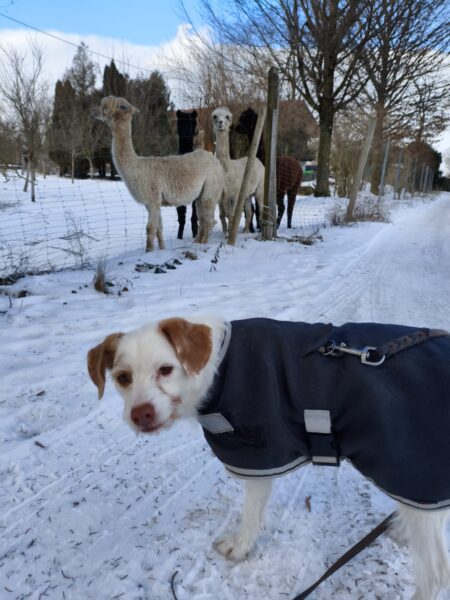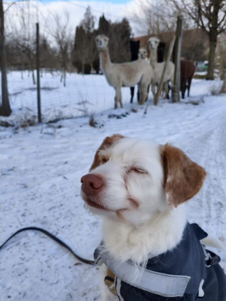 Heinz ging mit Elfie in Richtung Übersee, sie liefen gut gelaunt bis zu einer Weide mit Alpakas, die gleich neugierig an den Zaun kamen. Elfie blieb sehr gelassen, wofür es natürlich Lob und auch ein paar Leckerlies gab, so daß Elfie ganz cool noch für Fotos poste, die süße Maus! 🙂