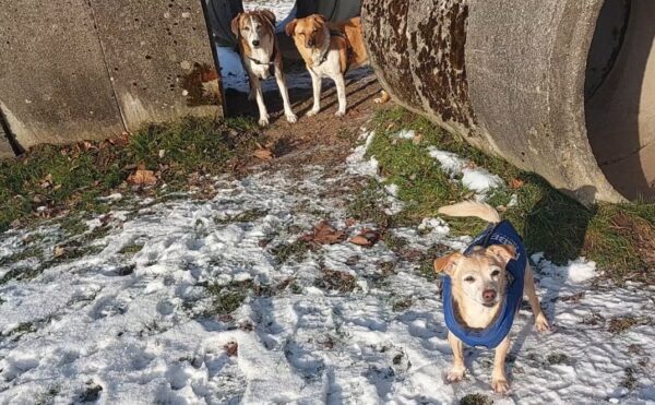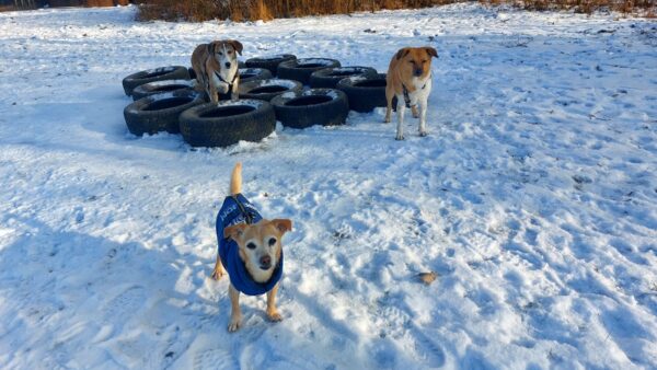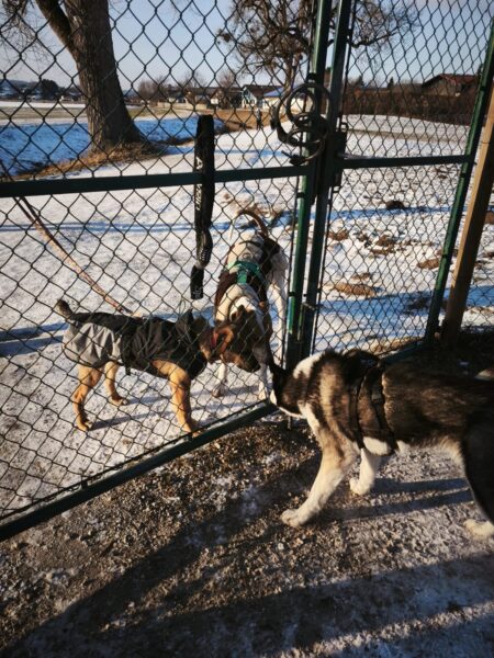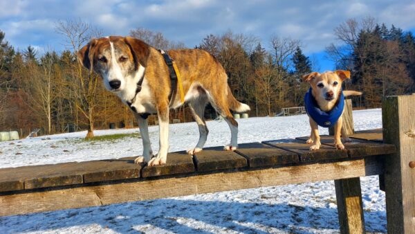 Heinz fuhr mittags mit Percy, Nicky und Laluna zum Hundeplatz, wo die drei gleich ausgelassen herumflitzten und -schnüffelten. Es war kälter geworden als in der Früh und so waren alle vier recht flott von einem Gerät zum nächsten unterwegs, turnten herum und hatten Spaß, die von Heinz augelegten Leckerlies einzusammeln. Zurück im TierHeim blieb Heinz noch zum Kuscheln und Aufwärmen bei den Dreien im Zimmer. 🙂