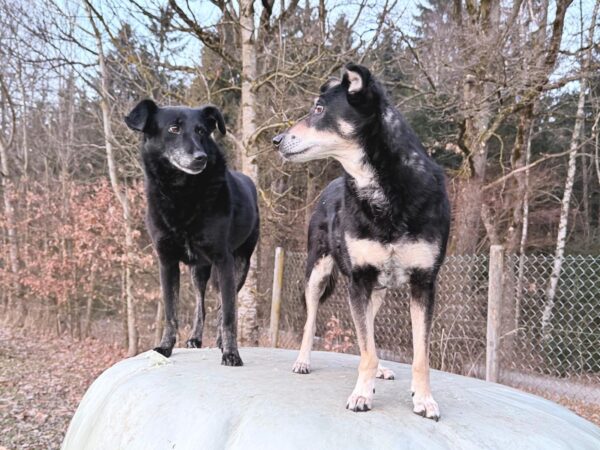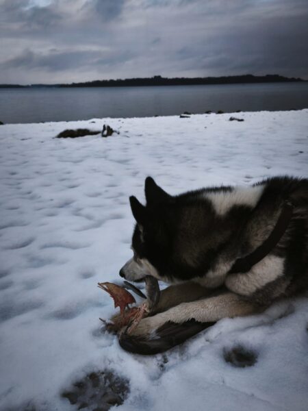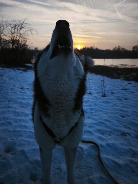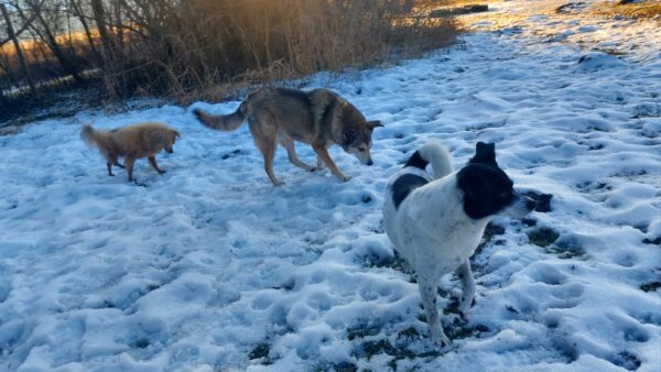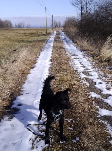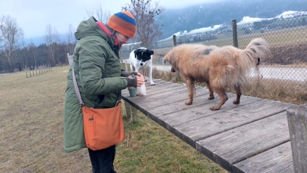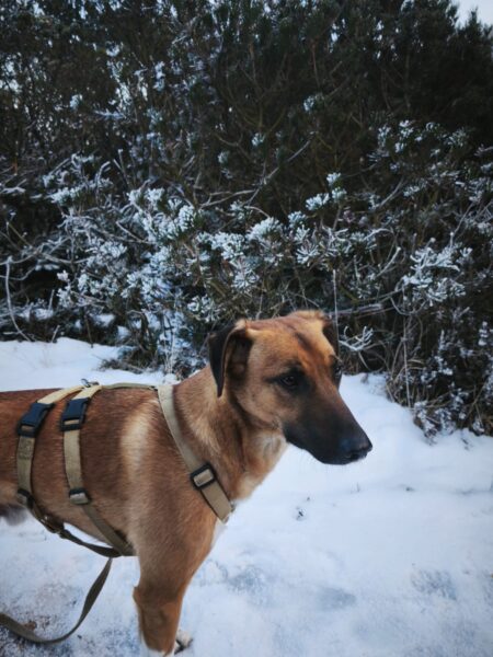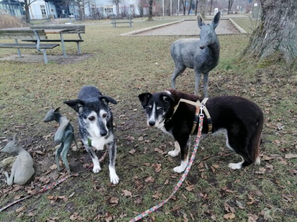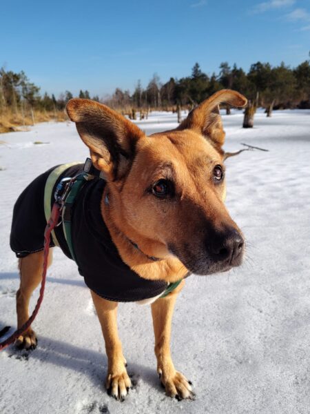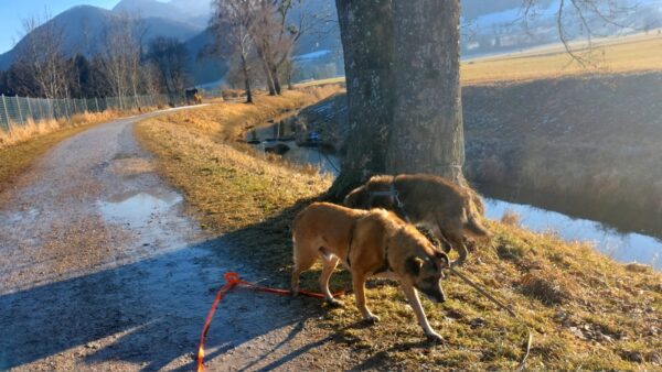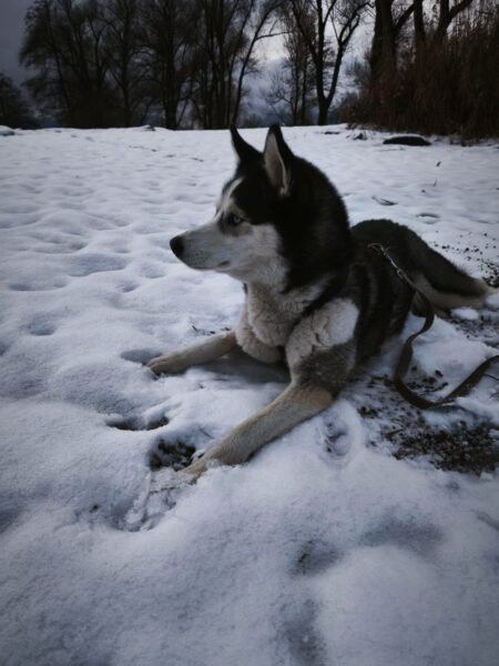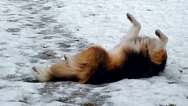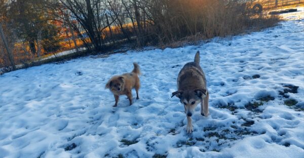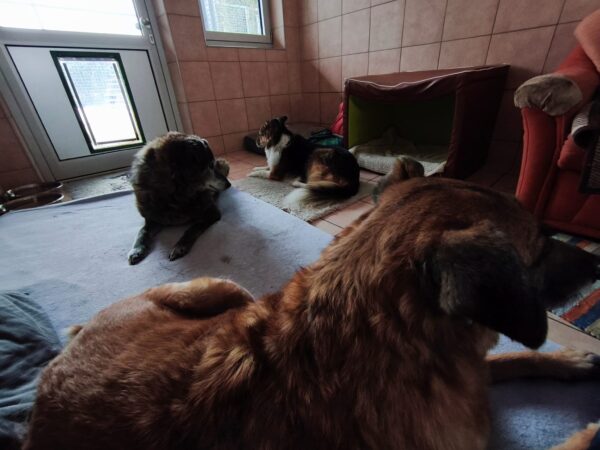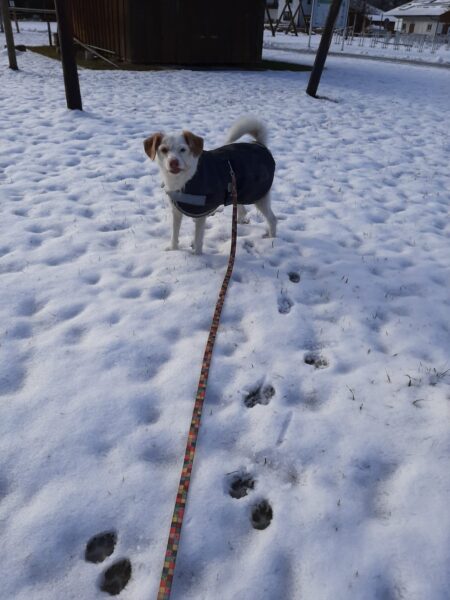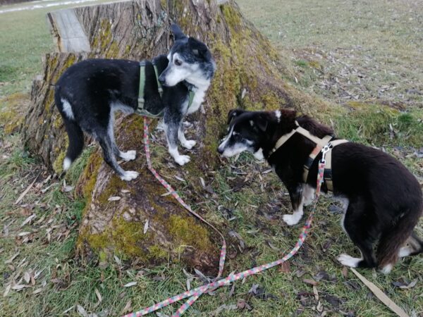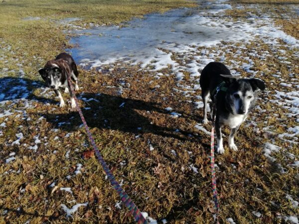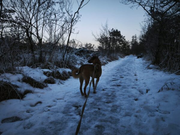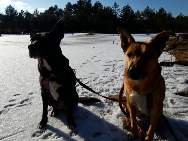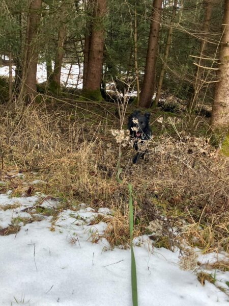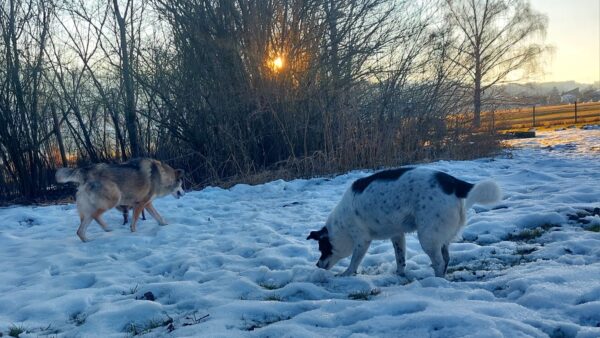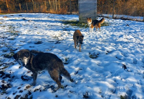 Renate ging nacheinander mit Aika und Momo in Richtung Waldweg, Jutta war derweil zum Kuscheln im Zimmer, so musste keine der beiden alleine bleiben. Die Mädels nahmen immer wieder gerne kleine Umwege und Abzweige in den Wald und an ihren Lieblingsstellen schnupperten sie nach Spuren, sammelten die ausgelegten Leckerchen ein und ließen sich ausgiebig kraulen. Aika wälzte sich auch gerne im Schnee. Insgesamt waren es zwei ruhige und entspannte Spaziergänge! 🙂