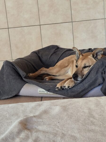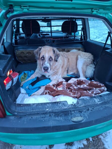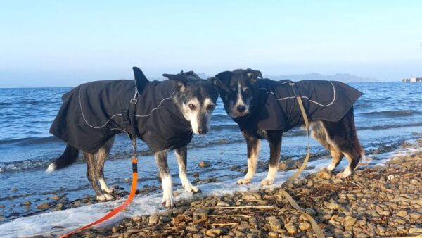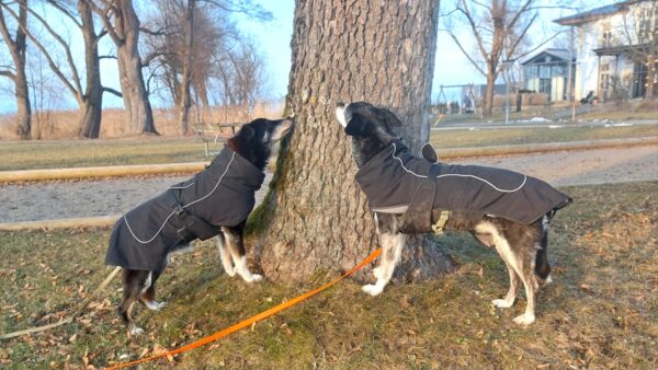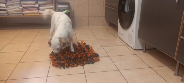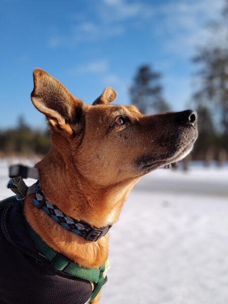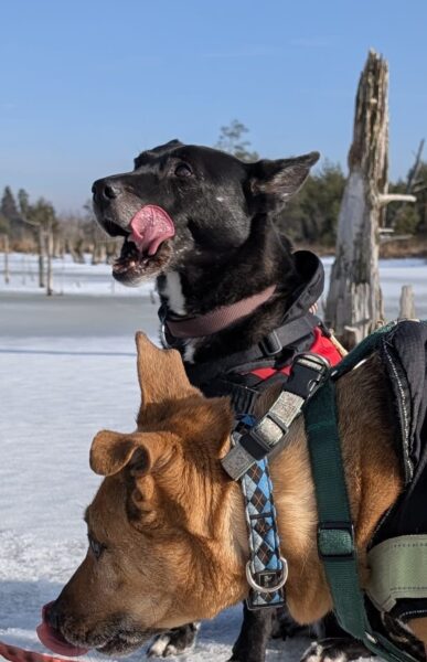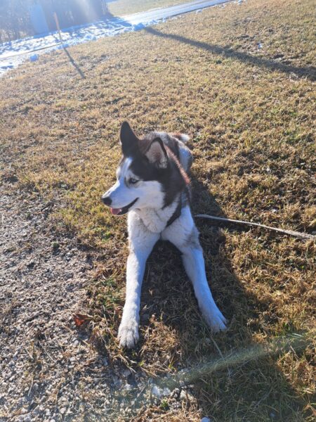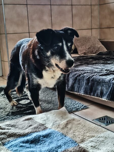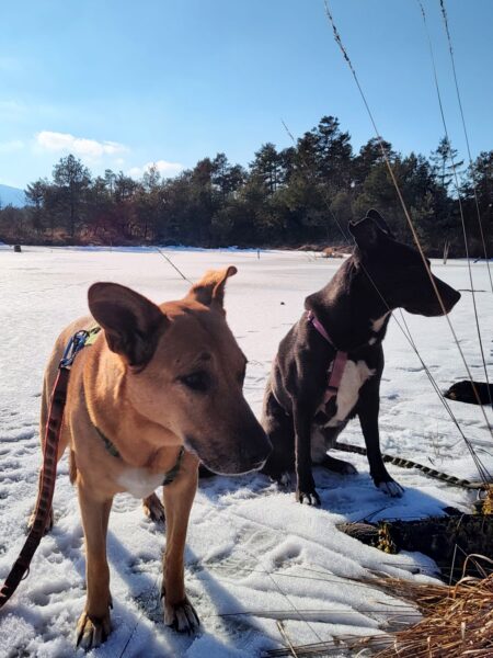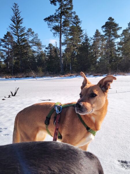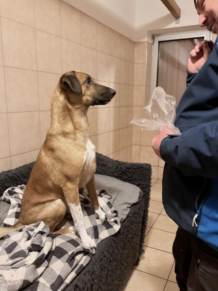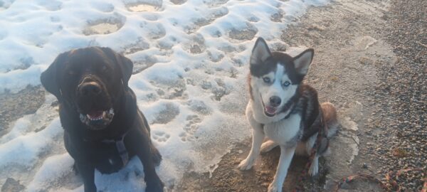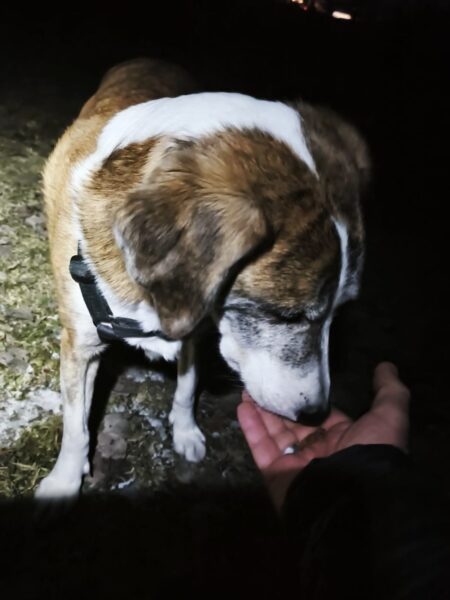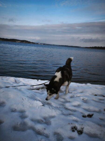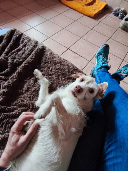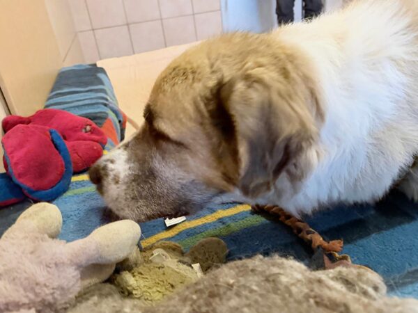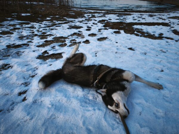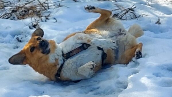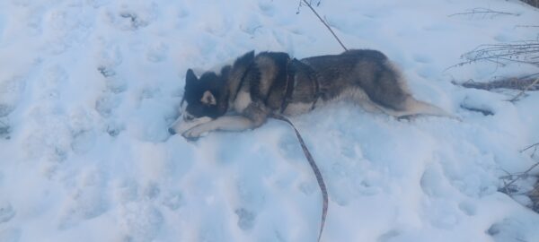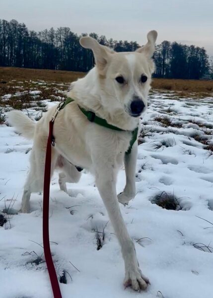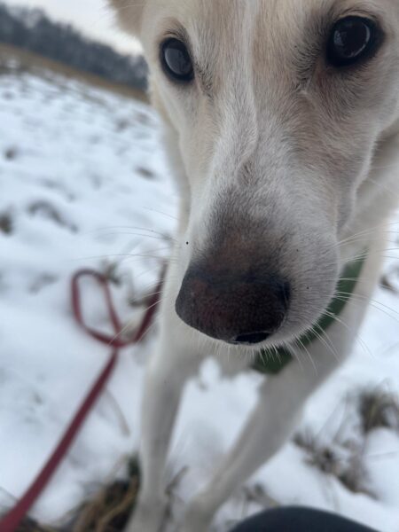 Renate ging nacheinander mit Aika und Momo in Richtung Waldweg, Jutta war derweil zum Kuscheln im Zimmer, so musste keine der beiden alleine bleiben. Die Mädels nahmen immer wieder gerne kleine Umwege und Abzweige in den Wald und an ihren Lieblingsstellen schnupperten sie nach Spuren, sammelten die ausgelegten Leckerchen ein und ließen sich ausgiebig kraulen. Aika wälzte sich auch gerne im Schnee. Insgesamt waren es zwei ruhige und entspannte Spaziergänge! 🙂