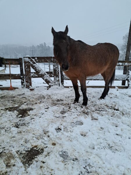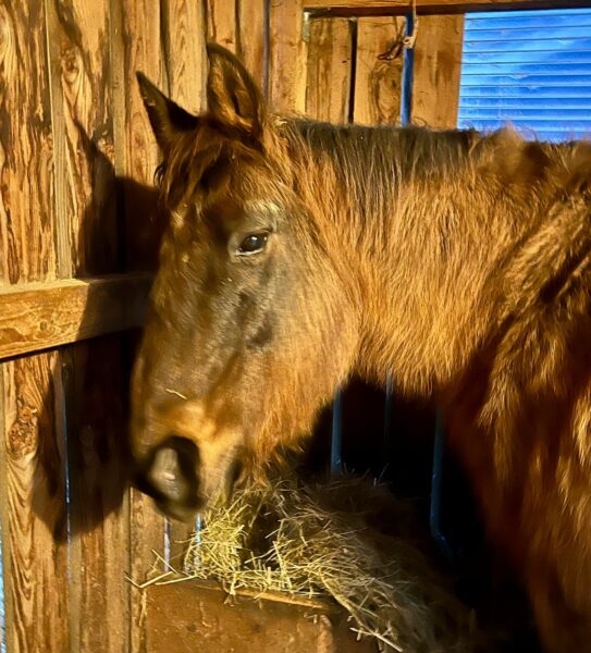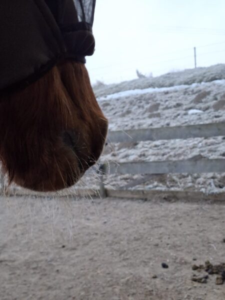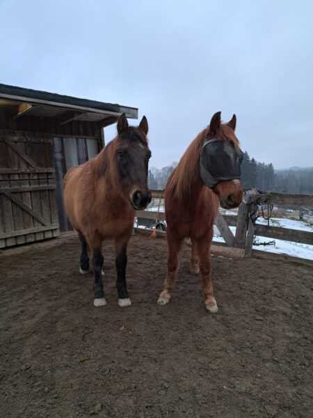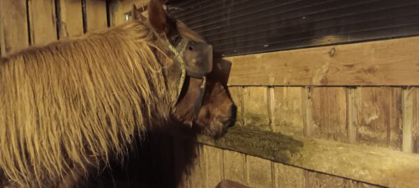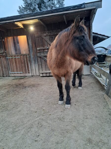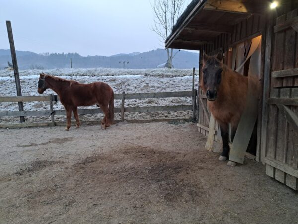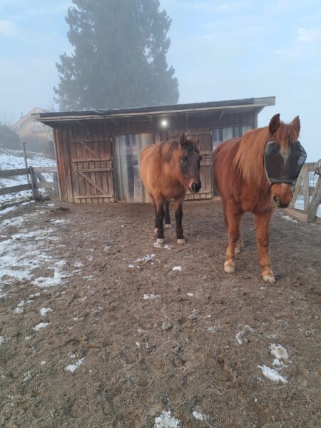 Am Morgen war Biggi bei den Pferden, die sie freundlich begrüßten und sich wie immer über ihr Müsli freuten. Gowinda war natürlich wieder zuerst fertig und wartete ungeduldig darauf, dass Wallace fertig wurde, um sich über seine Reste her zu machen. Biggi erledigte die täglichen Stallarbeiten, legte frisches Heu nach und kümmerte sich um die Fell- und Hufpflege. Noch ein bißchen Gruppenkuscheln, dann fuhr Biggi wieder. 🙂