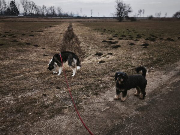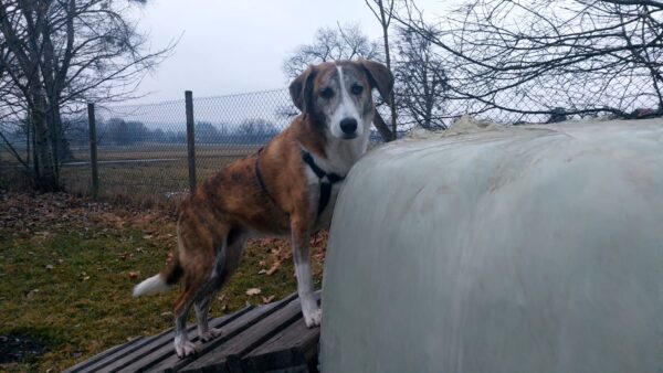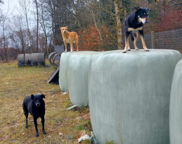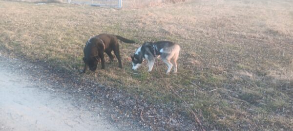 Danach fuhr Conny mit Rosalie, Lucky und Balto zum Hundeplatz, wo Karin die vier schon erwartete. Rosalie und Lucky sausten ein paar Mal zum Zaun und begrüßten andere Hunde. Wolle`s Herrchen gab ihnen ein Leckerlie durch den Zaun, denn die beiden kennen ihn schon eine Weile und so klappte das auch prima. Balto blieb lieber bei Karin und Conny und bekam natürlich auch ein Leckerlie. 🙂 Nach einer entspannten Runde mit Geräteturnen und Leckerliespielen gingen sie den Bachweg runter in Richtung Ort und dann querfeldein über die Wiese zum Waldweg und zurück. Es war ein superschöner Ausflug! 🙂