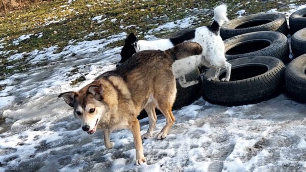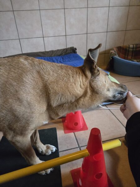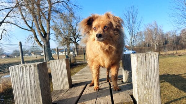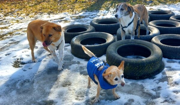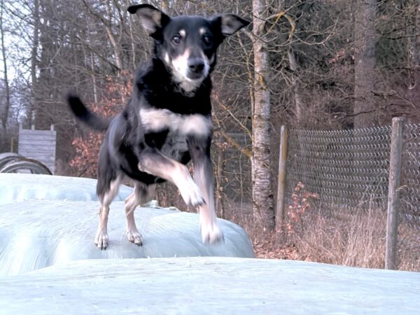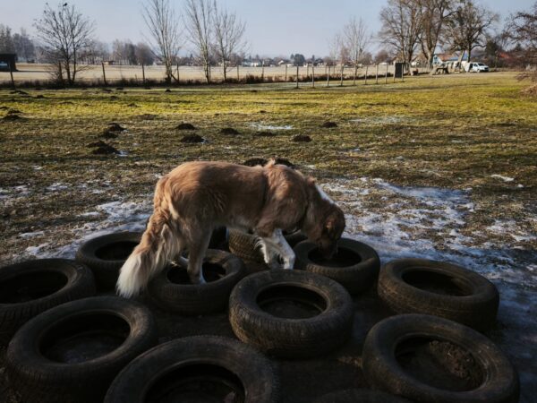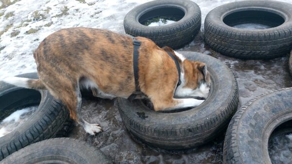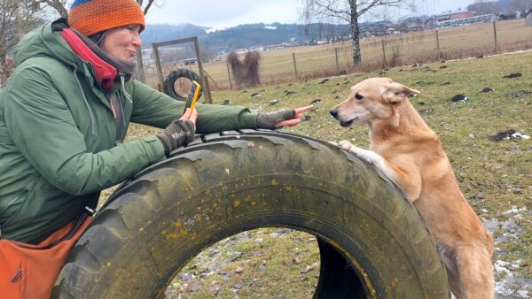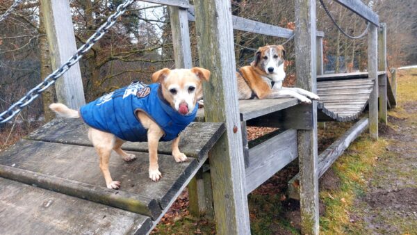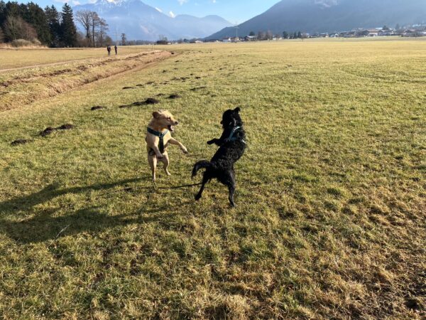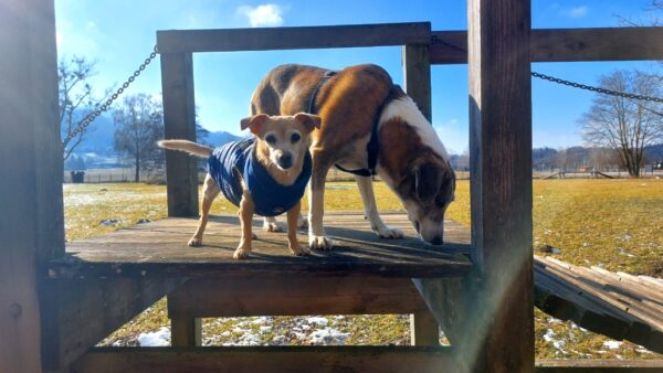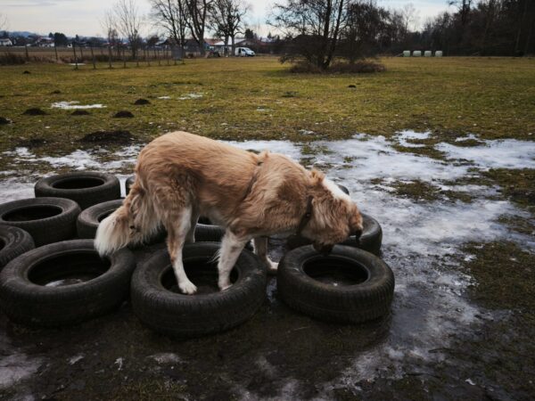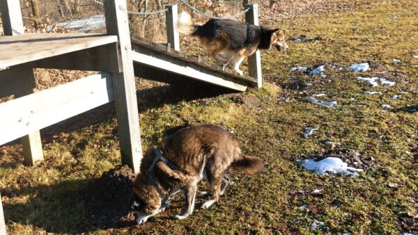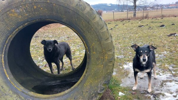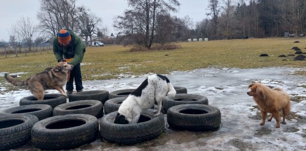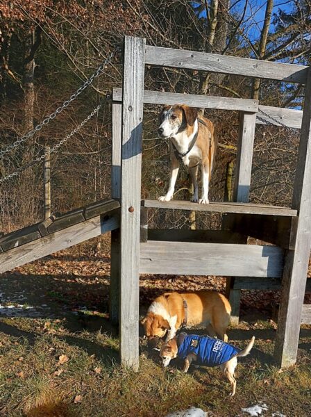 Auch mit Percy, Nicky und Laluna fuhr Conny zum Hundeplatz. Nachdem Alex mit Percy und den Mädels ein wenig Autotraining machte und alle drei entspannt im Auto blieben, fuhr Conny mit ihnen los. Oben angekommen stieg Percy gleich als erster aus und nachdem er, Nicky und Laluna Karin begrüßt hatten, war ausgiebiges Herumschnüffeln angesagt, danach sausten die Hunde fröhlich herum. Als sich ein Hubschrauber näherte, blieb Percy lauschend stehen, beobachtete kurz die Gegend und machte dann gleich gut gelaunt bei einem Leckerliesuchspiel mit. Auch andere Übungen an den Geräten machte er begeistert mit und alle hatten viel Spaß, was uns vor allem für Percy freut, der seit Silvester wenig Spaß an Ausflügen zum Hundeplatz hatte und schon gar nicht mehr ins Auto einsteigen wollte! 🙂