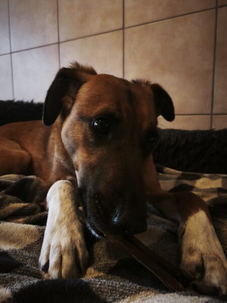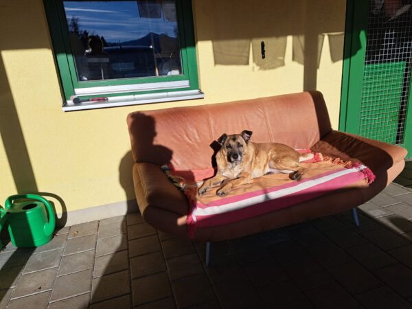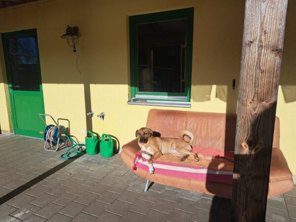 Am Nachmittag kam Bianca und machte mit Momo und Aika wieder Physiotherapie. Momo ließ sich anfangs wie immer ganz normal behandeln, aber schon nach kurzer Zeit wich sie aus und wollte nicht mehr. Aika hingegen schlief während der Behandlung ein, so wohl fühlte sie sich dabei. 🙂