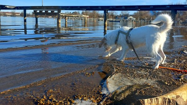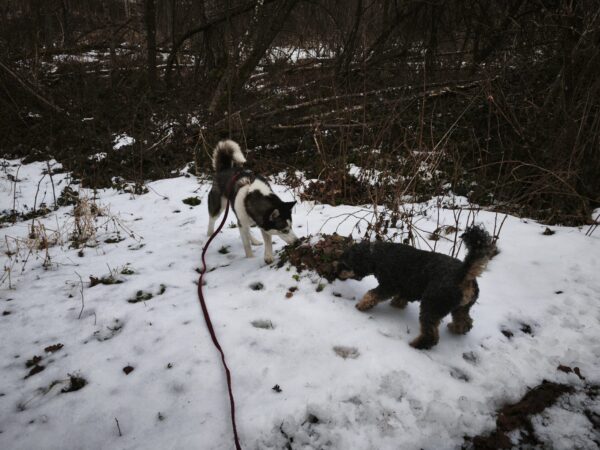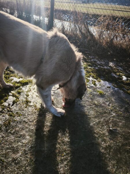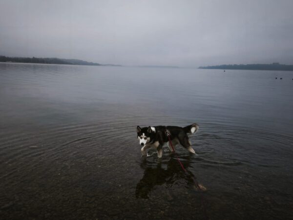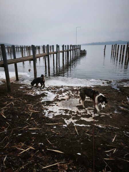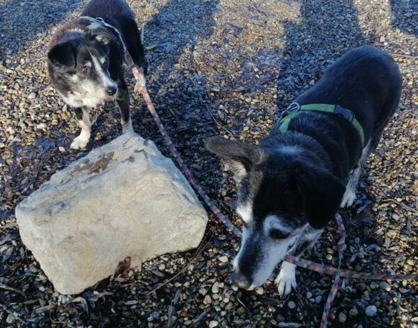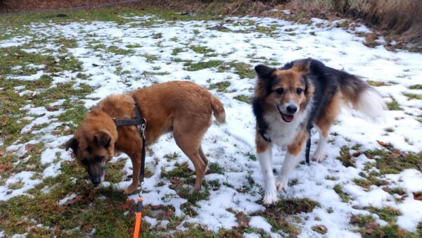 Anschließend ging Carsten mit Kirana und seinem Rüden Pablo zum Medical Park, wo die beiden eine tolle gemeinsame Runde drehten. Sie schnüffelten herum, plantschten am Uferrand und sammelten gemeinsam Leckerchen ein, die Carsten für sie versteckt hatte. 🙂