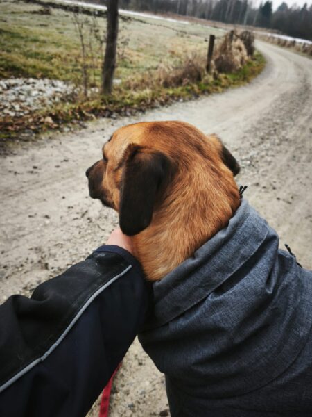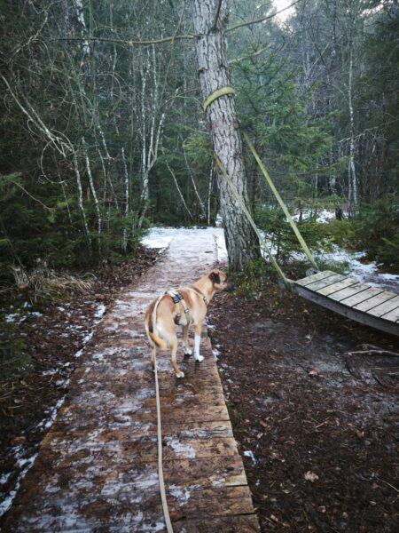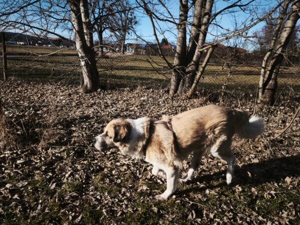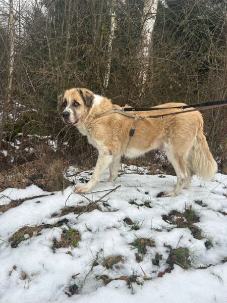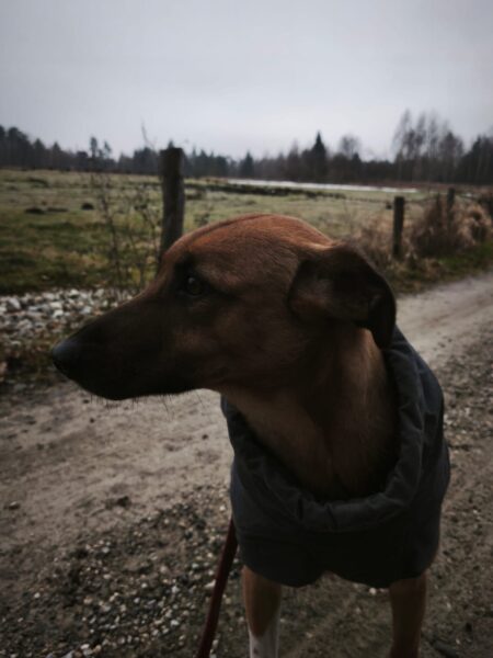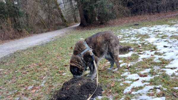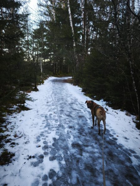 Danach fuhren Kerstin und Lukas mit Santana nach Rottau. Zuvor ließ er sich von Kerstin brav das Geschirr anziehen und sauste dann gleich erwartungsvoll zum Auto. Am Torfbahnhof angekommen gingen sie entspannt auf dem Waldweg, wo Santana viel herumschnüffelte und das Unterholz ablief. Ein entgegenkommender Zug verunsicherte ihn kurz, weshalb er Kerstin`s Nähe suchte und sich an ihr orientierte, aber als er sah, dass Kerstin und Lukas wenig beeindruckt von dem Zug waren, ging auch er entspannt weiter. Pünktlich zur Fütterungszeit waren die drei zurück im TierHeim, wo Kerstin ihm das Geschirr wieder auszog, bevor er seinen Napf bekam. ☺️