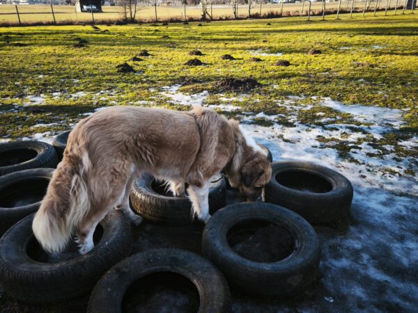 Danach war Conny mit Rosalie, Lucky und Balto auf dem Hundeplatz. Rosalie und Lucky flitzten wie immer mit Vollgas über die Fläche, während Balto in seinem Tempo über den Platz schnüffelte. Bei den Reifen trafen sich alle zur Leckerchensuche, danach kletterten sie noch über die anderen Geräte und Rosalie flitzte mit den Krähen herum. 🙂 Zum Abschluß drehte Conny mit den dreien noch eine Runde außen um das Gelände, was alle drei toll fanden. Sie schnüffelten viel und erkundeten die Gegend. 🙂