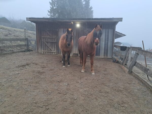 Auch am Abend war Biggi bei Gowinda und Wallace und hatte warmes Müsli für sie dabei. Während sie fraßen, legte Biggi frisches Heu auf, mistete ab und kontrollierte die Tränke. Dann kuschelte sie noch einen Moment mit den beiden, bevor sie wieder fuhr. 🙂