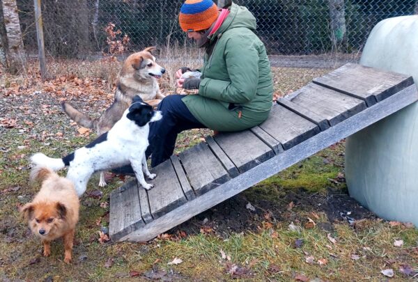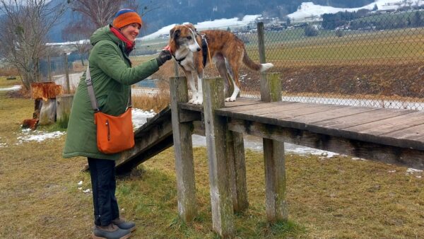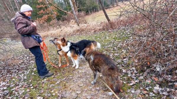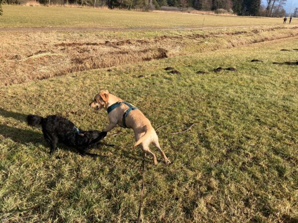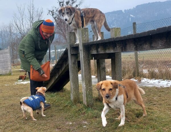 Conny war derweil mit Fio, Flora und Grisu auf dem Weg zum Hundeplatz. Die fröhliche Truppe stieg aus und schnüffelte gleich drauf los, erst dann bemerkten sie Karin – was für eine Riesenfreude! 🙂 Alle umzingelten sie und lachten sie an, dabei bemerkten sie nicht einmal, dass Leute am Bachweg liefen, sooo nett! Leider war richtig viel los und so gab es enorm viel zu flitzen und zu kommentieren für Grisu und Flora. Fio blieb gern bei Conny und Karin und ließ sich von Karin streicheln und loses Fell auszupfen. Alle hatten viel Spaß während einer Leckerlisuche, bei Pfötchenspielen und beim Geräteturnen. 🙂