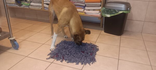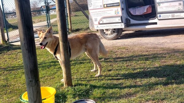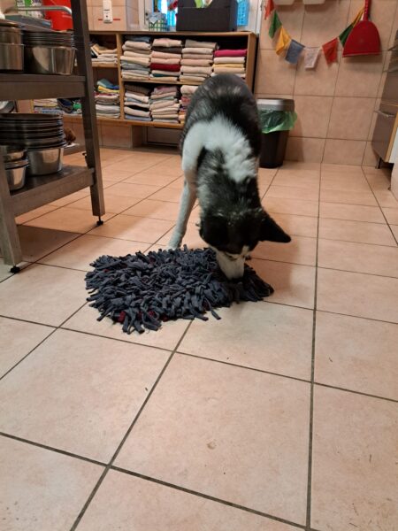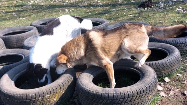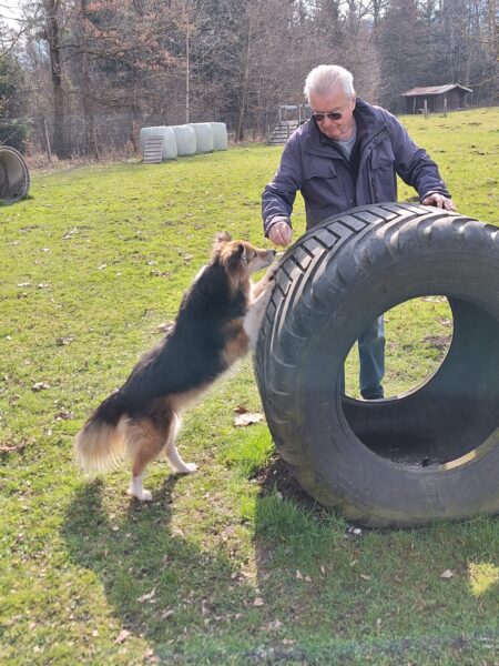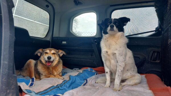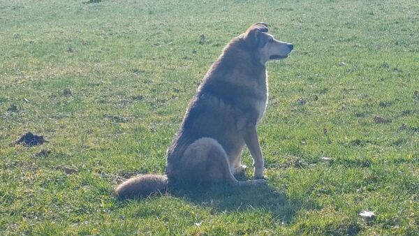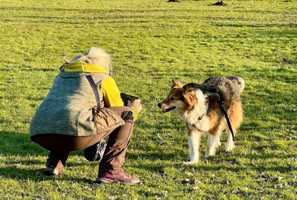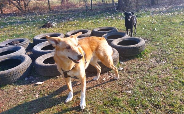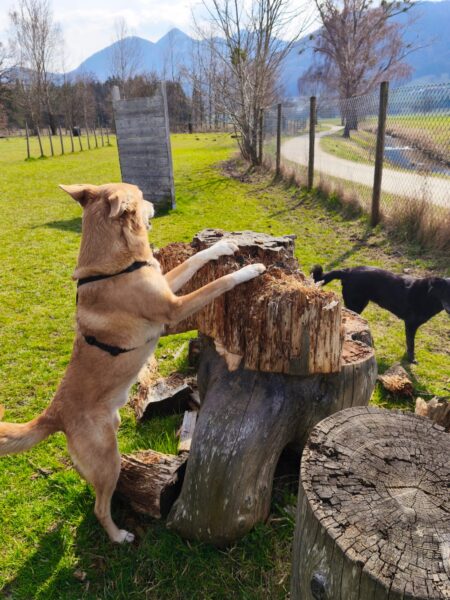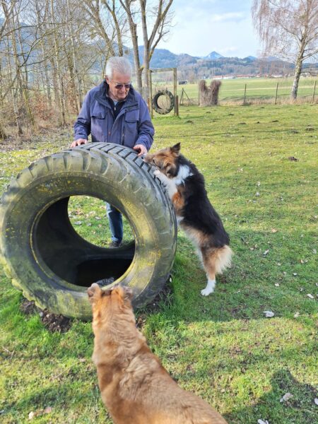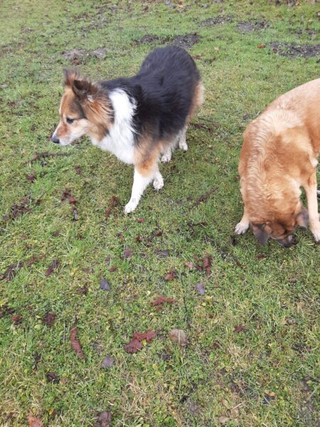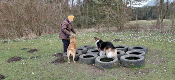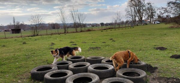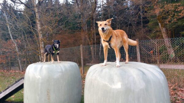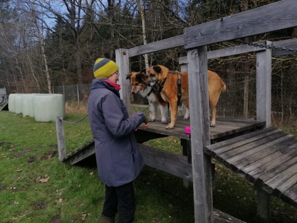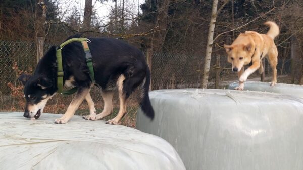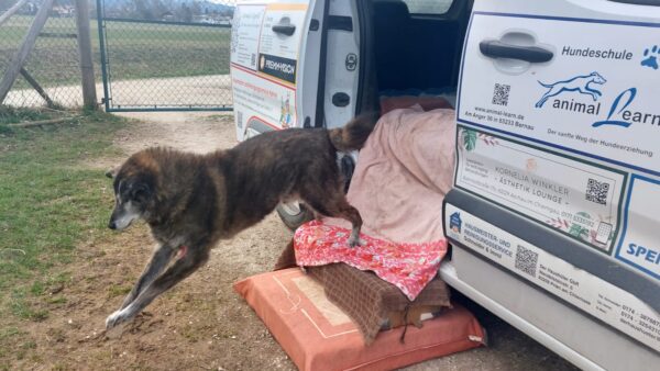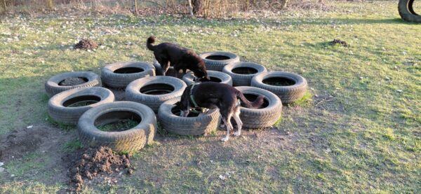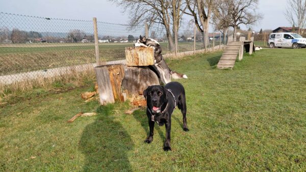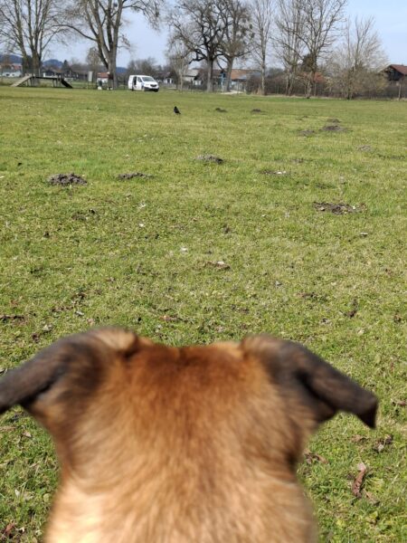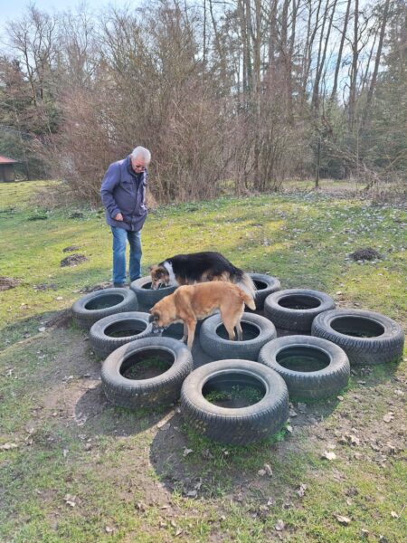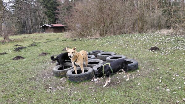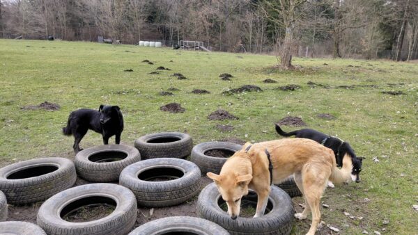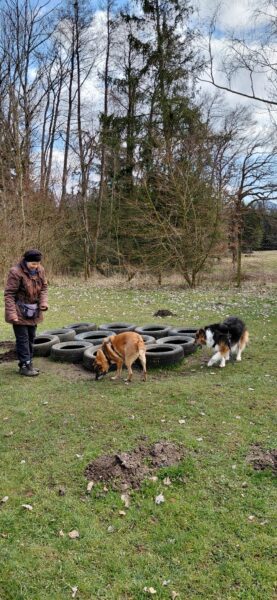 Karin war zum Kuscheln bei Fio und Flora, dann fuhr sie mit ihnen zum Hundeplatz. Oben angekommen, schnüffelten Fio und Flora gleich am Zaun entlang. Dann sammlten sie die Leckerlies ein, die Karin für sie ausgelegt hatte. Fio drehte anschließend eine kleine Runde über das Gelände und stieg dann schon mal ins Auto, in dem er auf Flora wartete, bis diese fertig mit dem Schnüffeln war und ebenfalls einstieg. 🙂