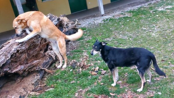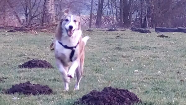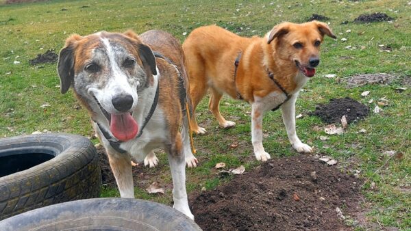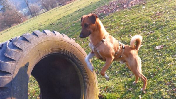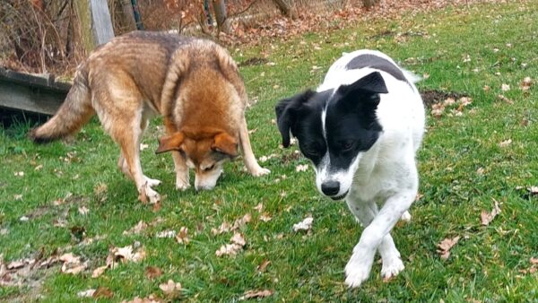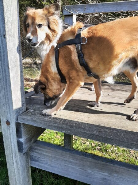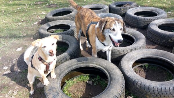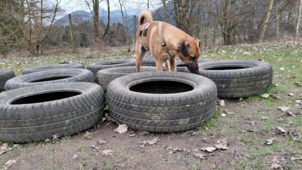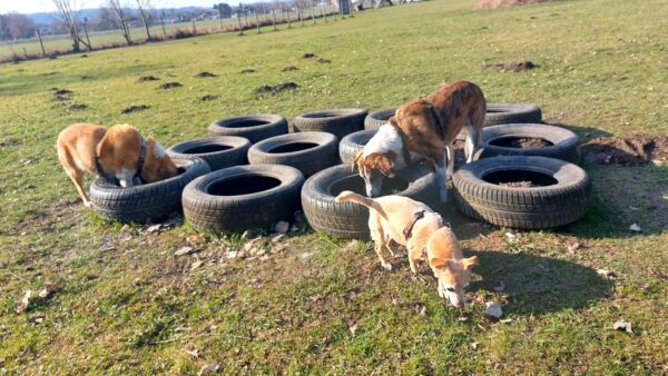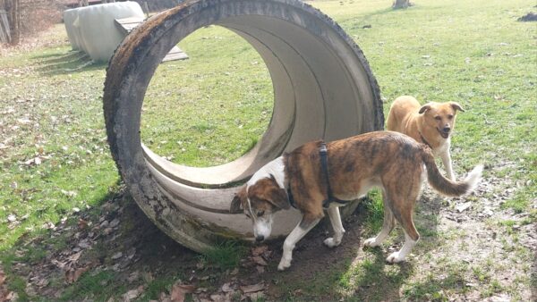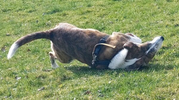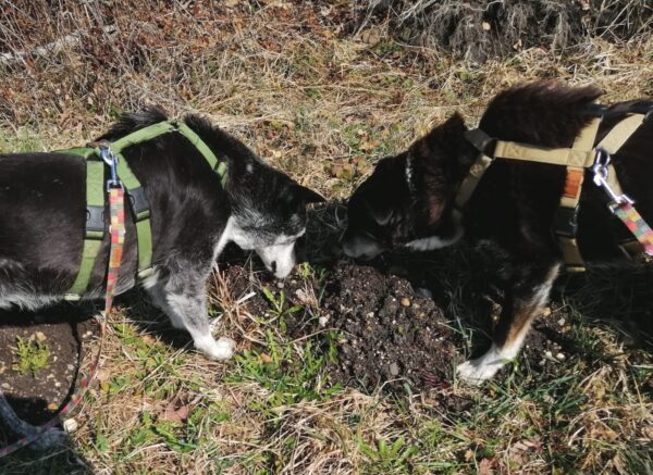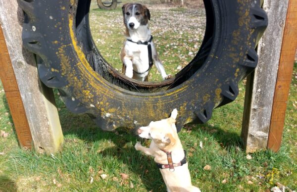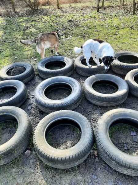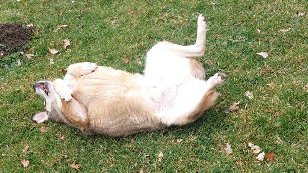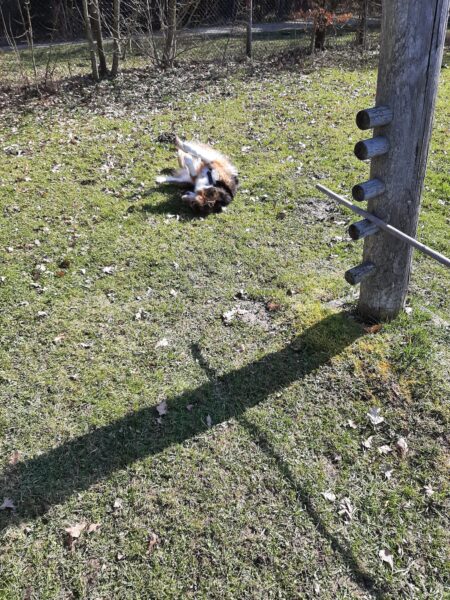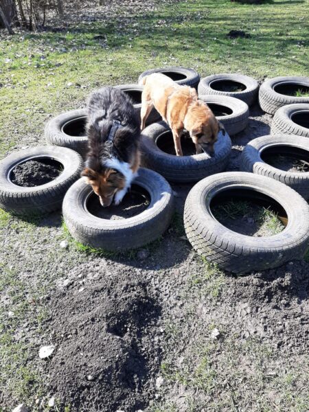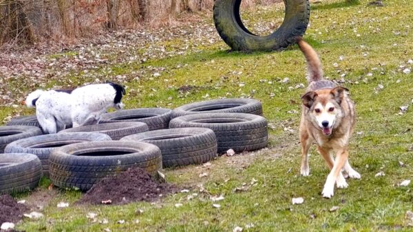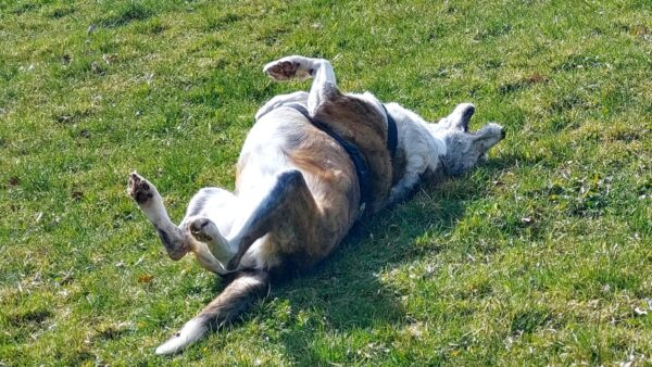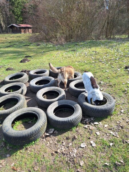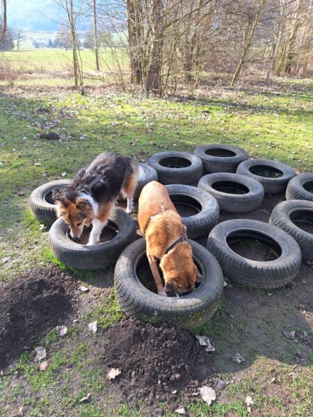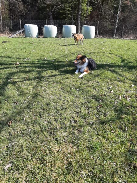 Danach durften Rosalie und Lucky mit Fred zum Hundeplatz. Im Zimmer begrüßten sie und Balto ihn fröhlich, während Alex Rosalie und Lucky die Geschirre anzog, bekam Balto ein paar Leckerlies von Fred. Auf dem Platz angekommen rannten Rosalie und Lucky zu den Reifen, wo sie sich schon auf die Leckerliesuche freuten, die sie gewissenhaft einsammelten. In der angenehm warmen Sonne bummelten sie ihre Runde, Rosalie wälzte sich immer wieder wohlig im Gras und Lucky kam zum Kuscheln zu Fred. 🙂