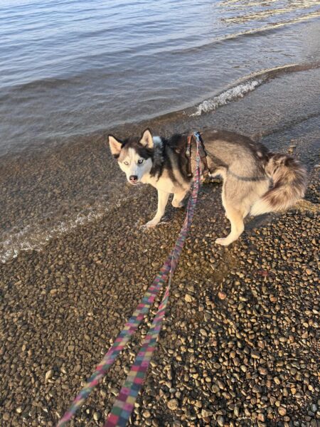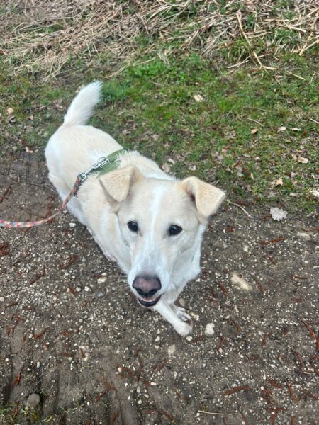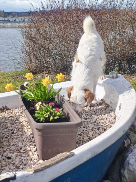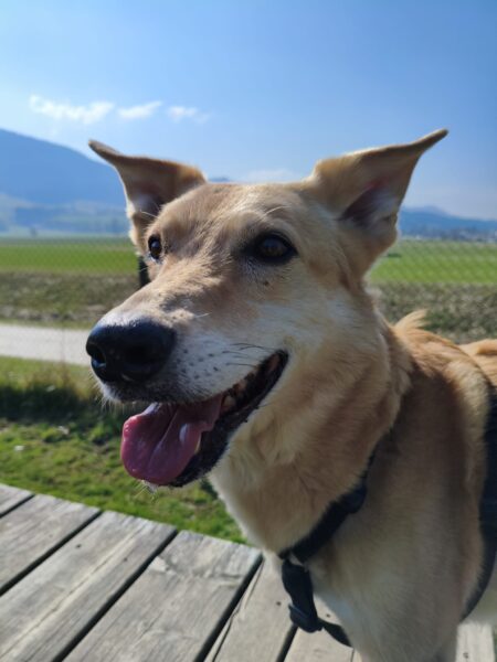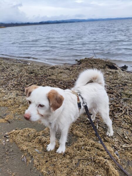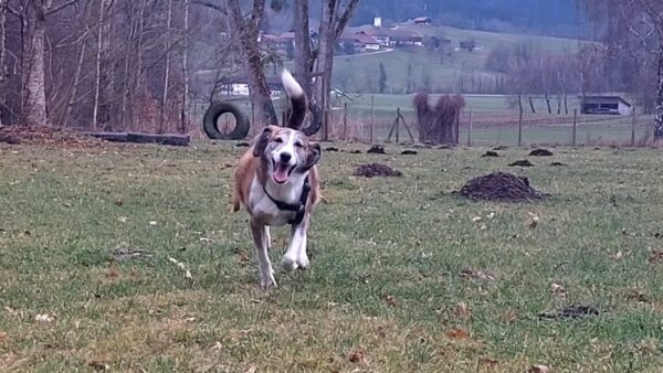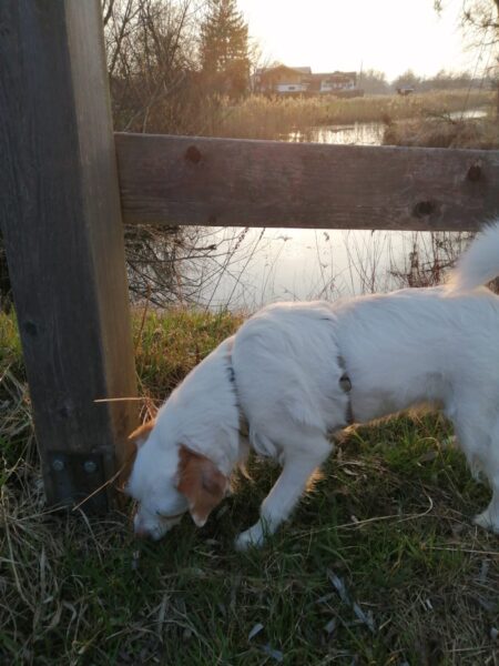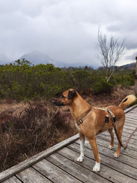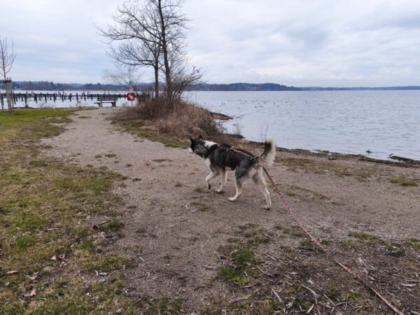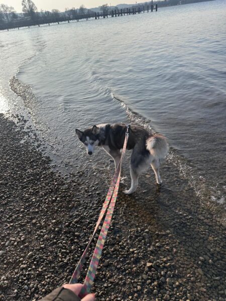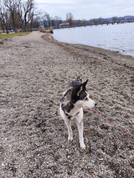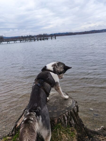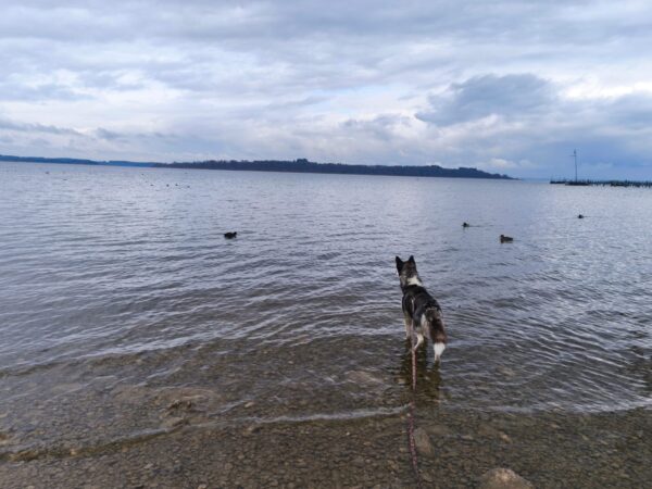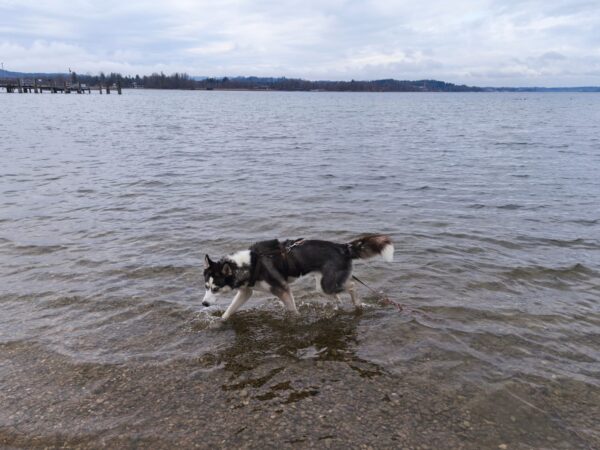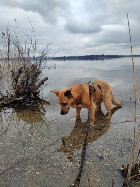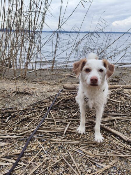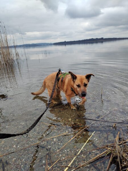 Kirana freute sich über einen schönen Spaziergang mit Martina am Chiemsee, wo Kirana jede Menge Spaß hatte, denn es roch überall spannend und sie erkundete begeistert viele Mauselöcher und Spuren. Im Wasser zu plantschen und Leckerlies zu suchen fand sie natürlich auch klasse. 🙂