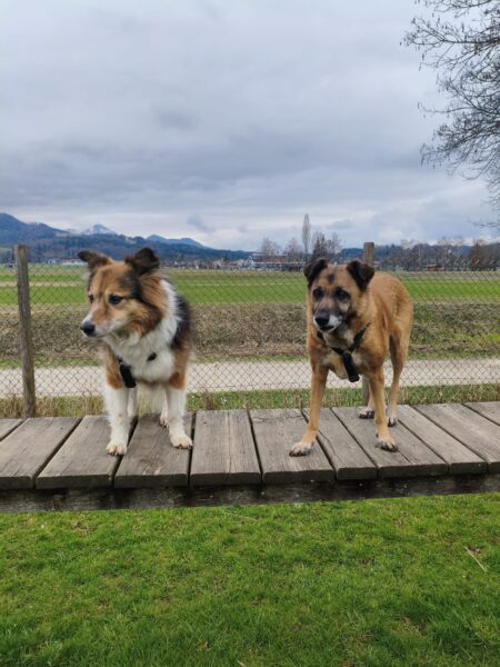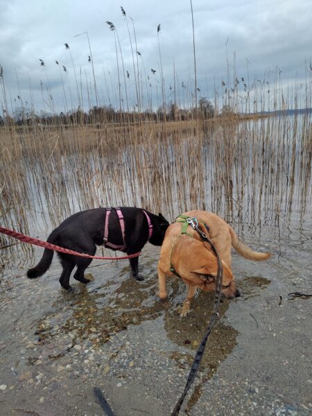 Danach war Biggi zur Gassigehereinführung mit Elfie und Carina in Richtung Übersee unterwegs. Die Einführung verlief ein wenig holperig, Elfie war Carina wohl schon bei der Begrüßung im Hof zu ungestüm und Carina sehr unsicher im Umgang mit Hunden. Biggi blieb deshalb die ganze Runde dabei, sie hätte die beiden leider nicht guten Gewissens alleine weiter gehen lassen können.