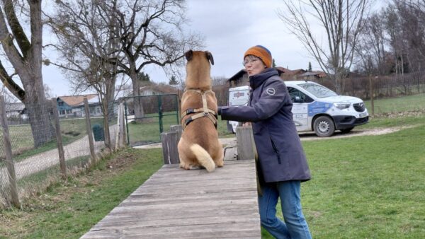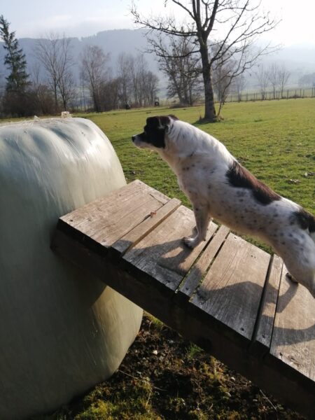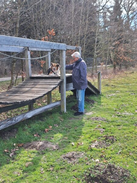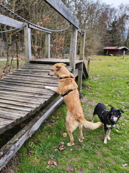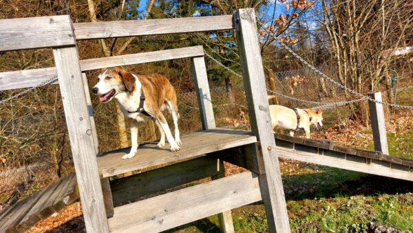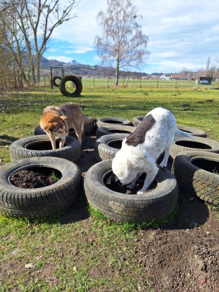 Fred fuhr mit Fio und Flora zum Hundeplatz. Die beiden freuten sich sehr als er sie abholte und sausten sofort vom Zimmer durch den Hof ins TierHeimauto. Oben angekommen liefen sie neugierig schnüffelnd kreuz und quer, dann erkundeten sie gemeinsam mit Fred die Geräte und hatten viel Freude während einer Leckerliesuche. Es war ein schöner und entspannter Ausflug für alle drei. 🙂