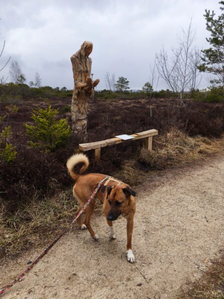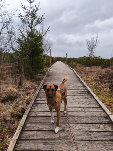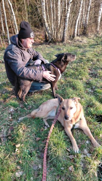 Anschließend fuhr Chris mit Santana nach Rottau zum Torfbahnhof. Mittlerweile waren kaum noch Leute unterwegs und so hatten die beiden den Spazierweg für sich. Entsprechend ruhig und entspannt konnten sie die gemeinsame Zeit genießen, Santana schnüffelte fröhlich hüpfend über die Wiesen, kuschelte dann ganz innig mit Chris und freute sich zwischendurch über Leckerliesuchen, die er wieselflink einsammelte. 🙂