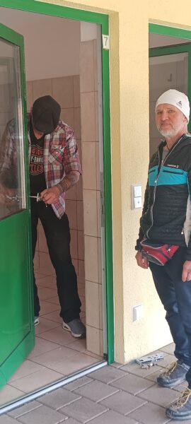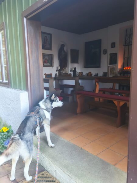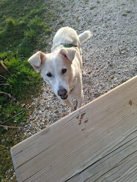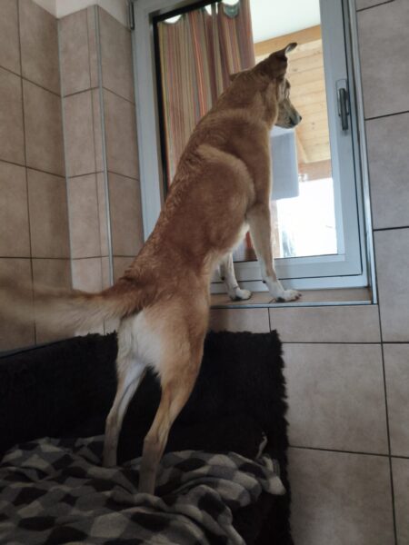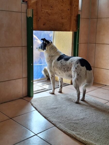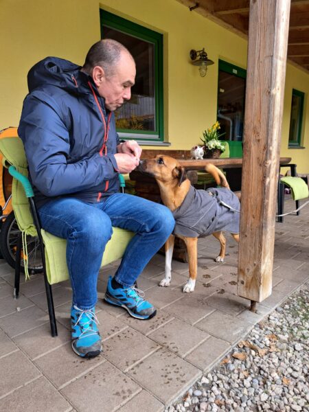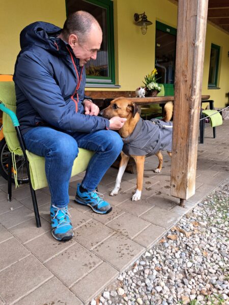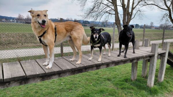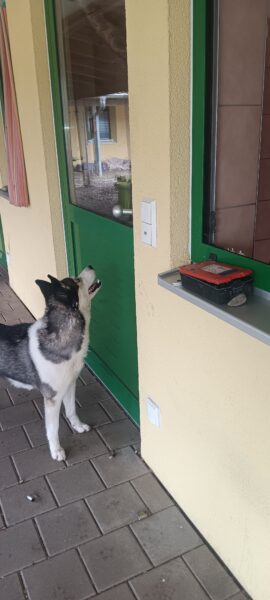 Rosalie, Lucky und Balto verbrachten am Vormittag viel Zeit im Hof, um das Einsteigen ins Auto mit der Rampe zu üben, damit es Balto etwas leichter fällt. Alle drei fanden die Rampe allerdings gruselig. Das müsste wirklich in Ruhe geübt werden. Die bekannte Treppe war für Rosalie und Lucky gut, aber Balto ging nur die erste Stufe hoch, um sich das dort deponierte Leckerlie zu holen, dann drehte er eine Runde um das Auto und holte ein weiteres Leckerlie von der Stufe… einsteigen wollte er aber nicht. Balto legte sich dann im Schatten vor dem Zimmer hin, Lucky stupste ihn an und positionierte sich vor der Zimmertür und auch Rosalie war solidarisch und legte sich knapp neben Balto ab. Es war eine klare Kommunikation und als wir die Zimmertür öffneten, ging Balto gleich hinein, Rosalie und Lucky folgten. 🙂 So ein tolles Trio! 🙂