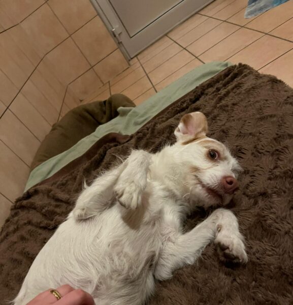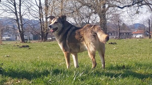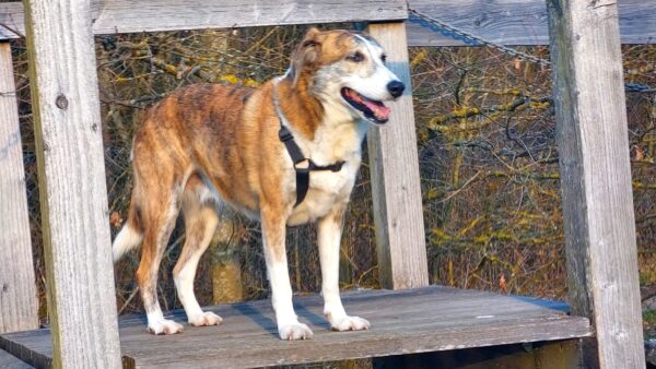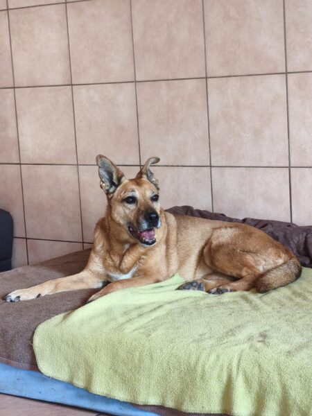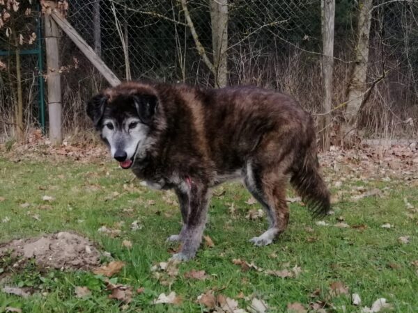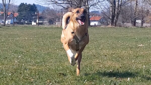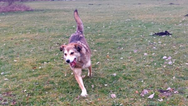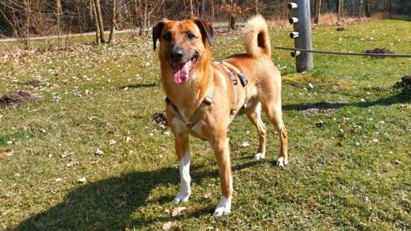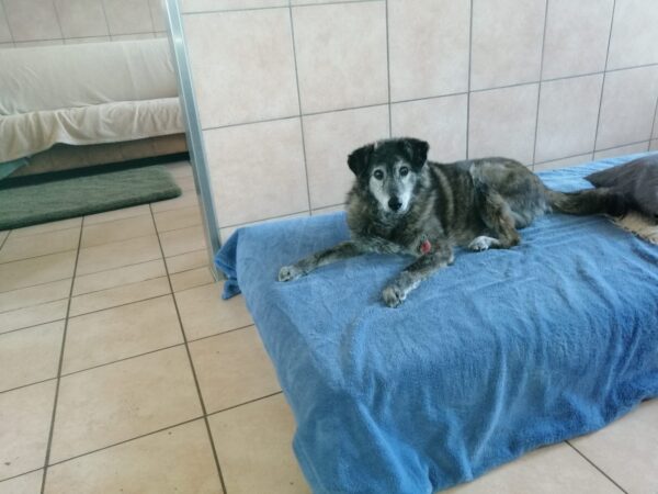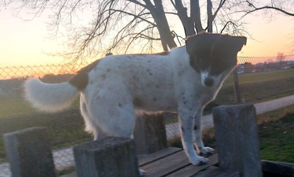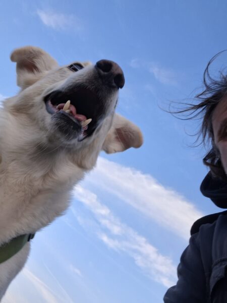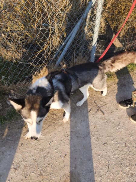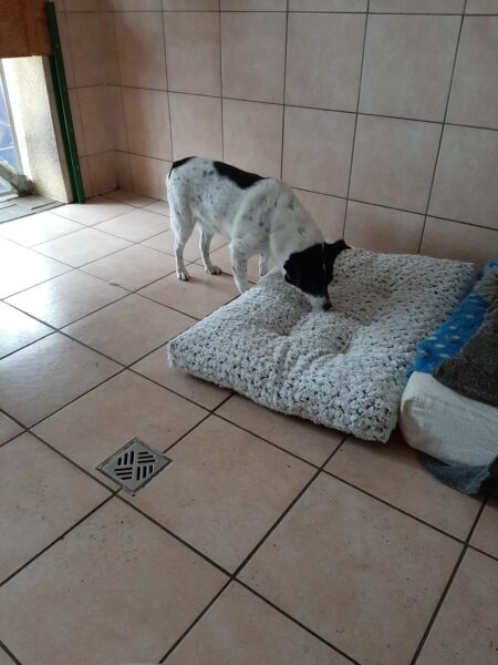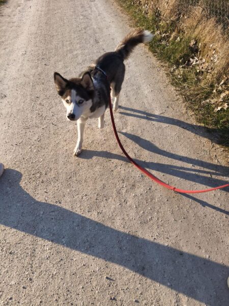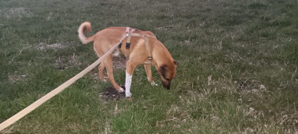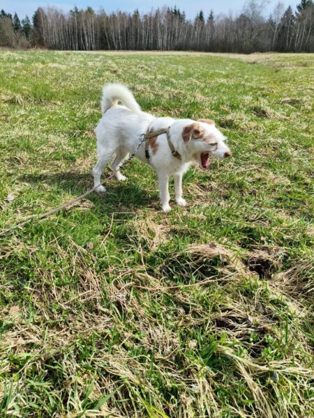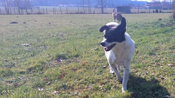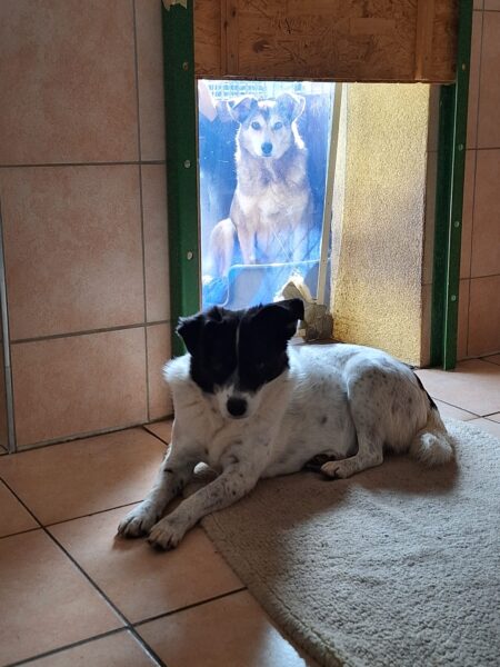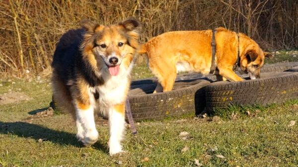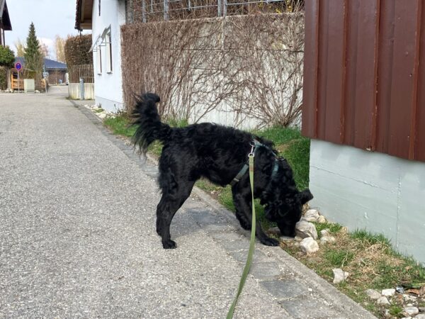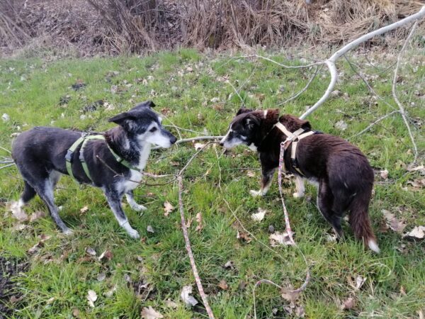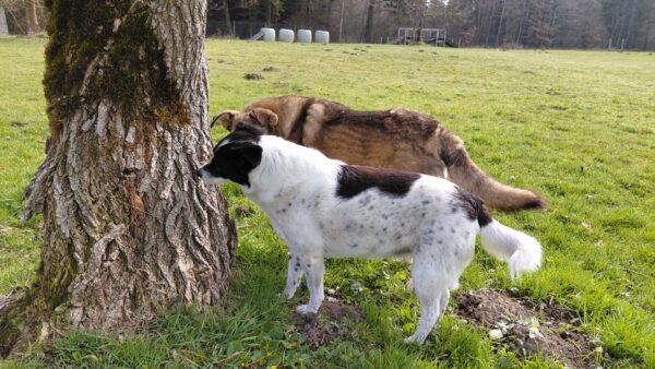 Da sich Santana und Camino am Zaun so gut verstanden, beschlossen wir, einen gemeinsamen Spaziergang mit den beiden zu machen. Karin ging mit Santana voraus auf die Wiese gegenüber vom TierHeim, Dani kam mit Camino nach. Anfangs freuten sich die beiden sich zu sehen, aber Santana war noch etwas nervös und zeigte Camino, dass er bitte Abstand braucht. Camino akzeptierte das sofort und versuchte auf alle möglichen Arten, Santana zu zeigen, dass er ungefählich ist. Er wälzte sich, robbte am Boden und nahm auch einen Stock, den er Santana hinlegte – sooo niedlich! 🙂 Santana war durchaus neugierig, aber noch sehr unsicher. Gemeinsam gingen sie dann mit Abstand über die Wiese, was gut klappte, bis… leider ein Radfahrer auf dem angrenzenden Weg vorbei kam und Santana sich total aufregte, deshalb Karin und Dani die Übungseinheit abbrachen und zurück ins TierHeim gingen, wo Karin Santana ins Zimmer brachte und noch kurz bei ihm blieb. Man merkte ihm an, dass ihn das Ganze sehr angestrengt hatte, er brauchte erstmal Ruhe.