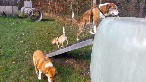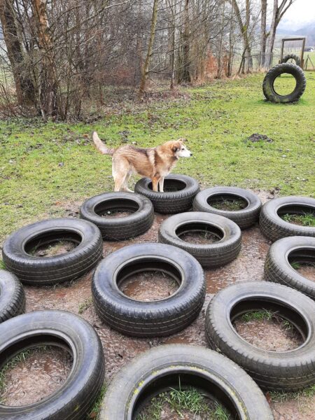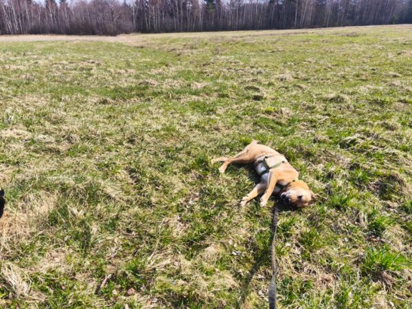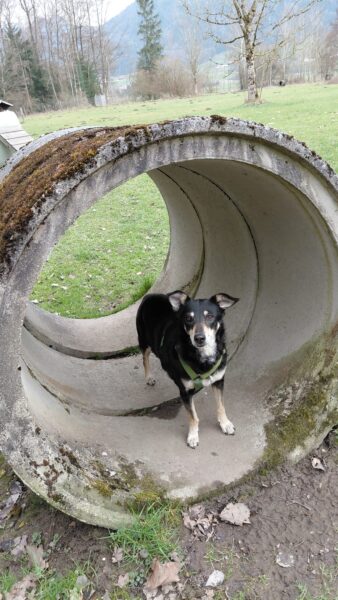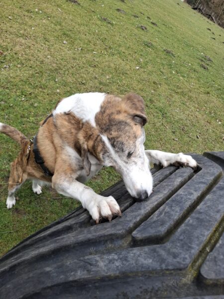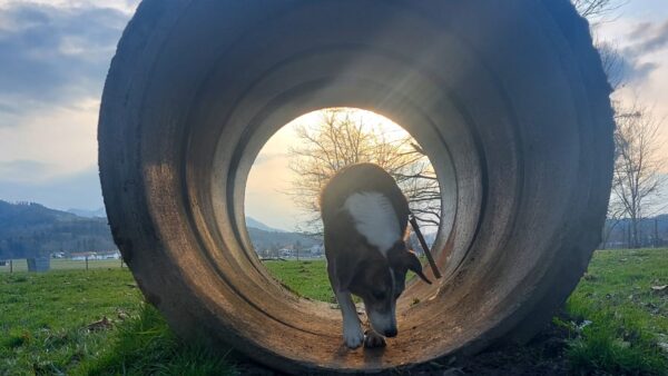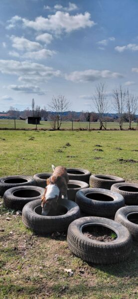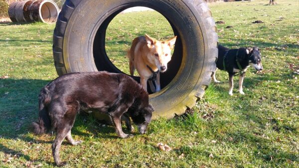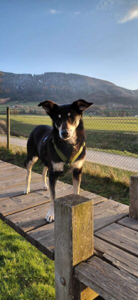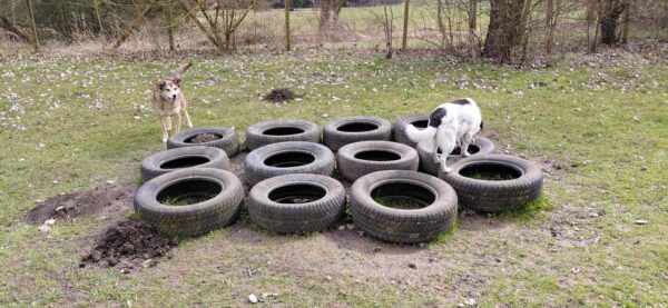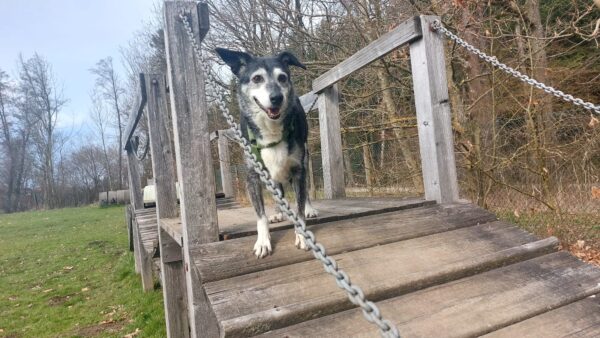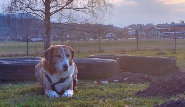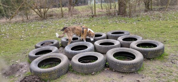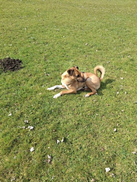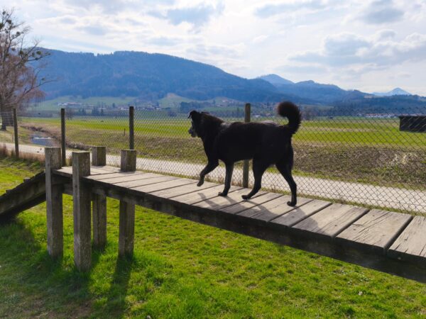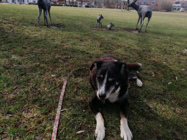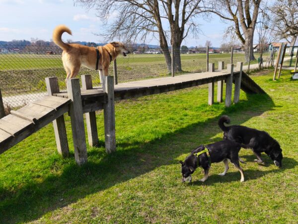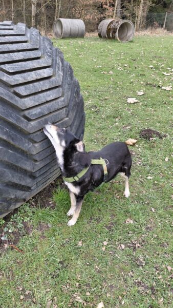 Im Anschluss fuhr Karin mit Lena zum Hundeplatz, die erst ein paar Runden flitzte und dann in aller Ruhe herumschnüffelte. An den Geräten fand sie die Leckerchen, die Karin für sie ausgelegt hatte und freute sich darüber, dann legte sie sich ins Gras und beobachtete die Gegend. 🙂
