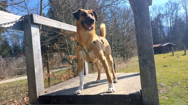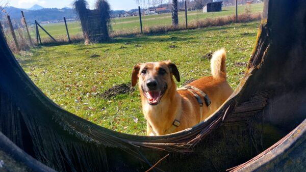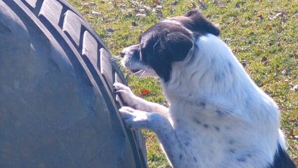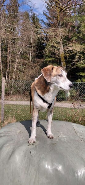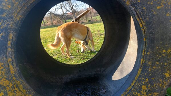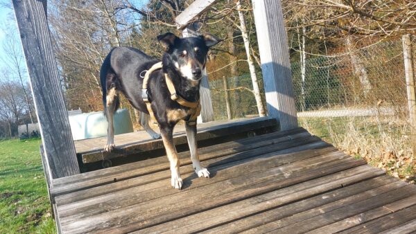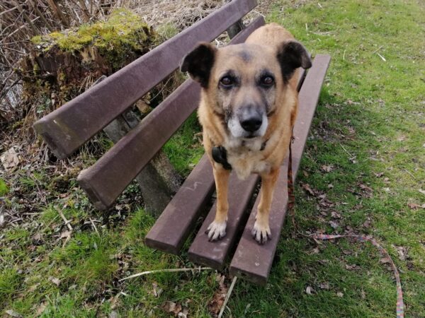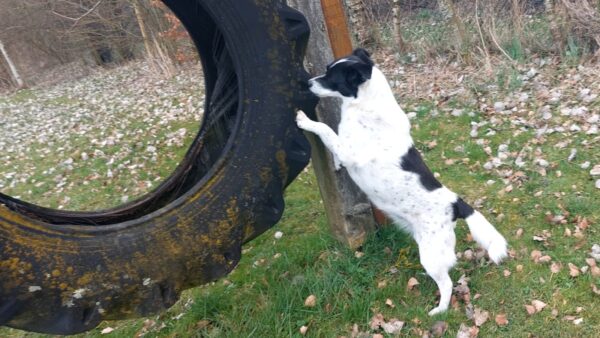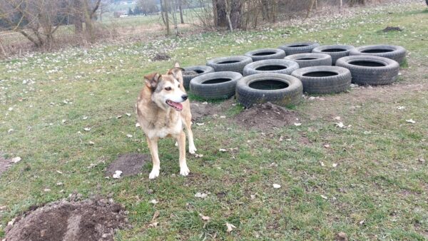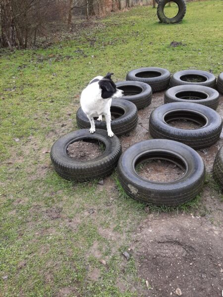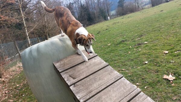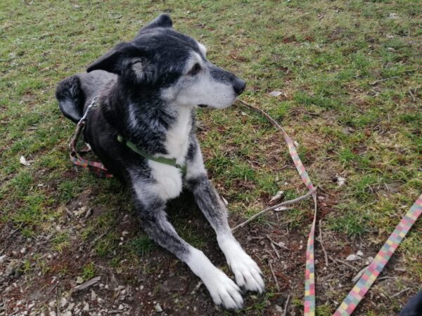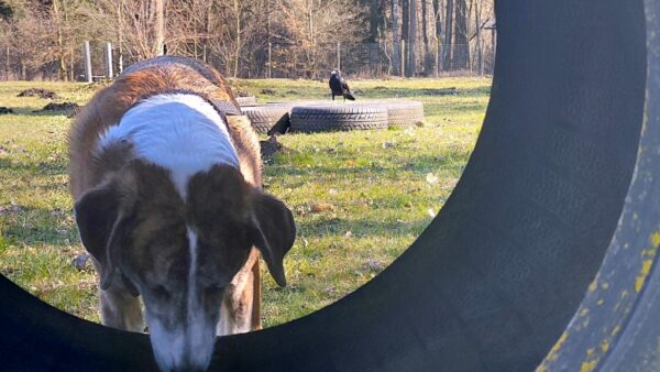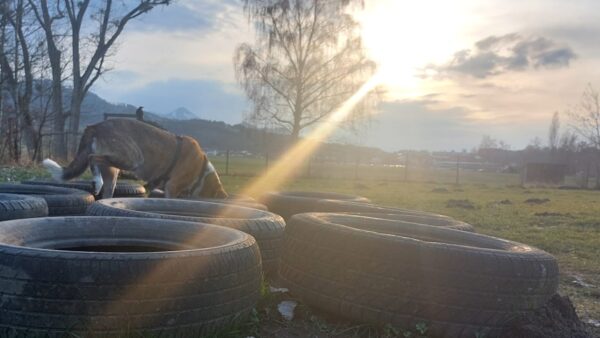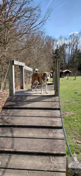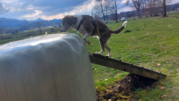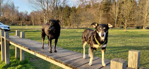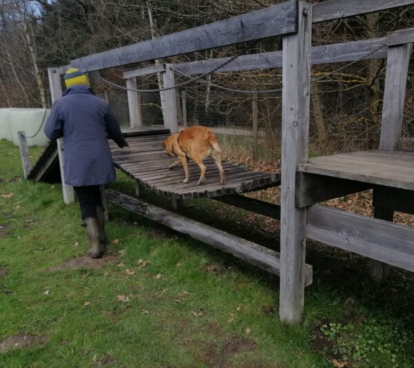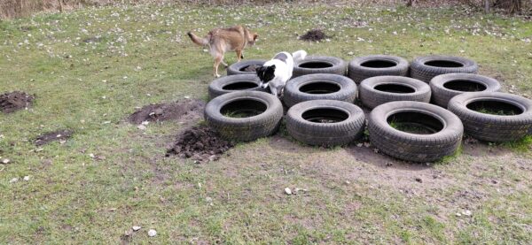 Im Anschluss fuhr Karin mit Lena zum Hundeplatz, die erst ein paar Runden flitzte und dann in aller Ruhe herumschnüffelte. An den Geräten fand sie die Leckerchen, die Karin für sie ausgelegt hatte und freute sich darüber, dann legte sie sich ins Gras und beobachtete die Gegend. 🙂