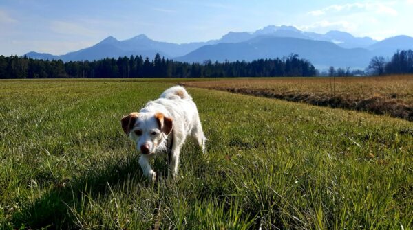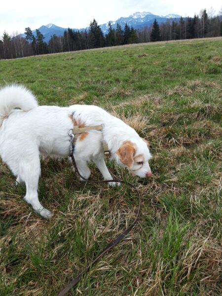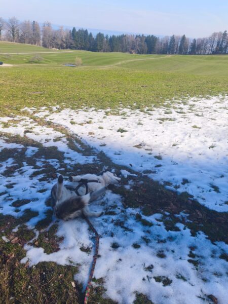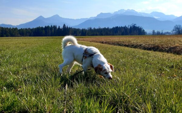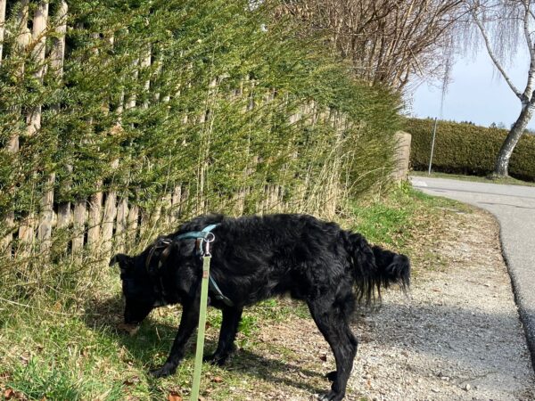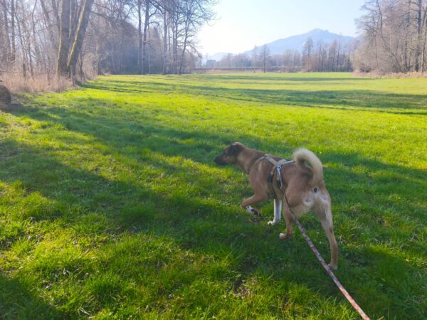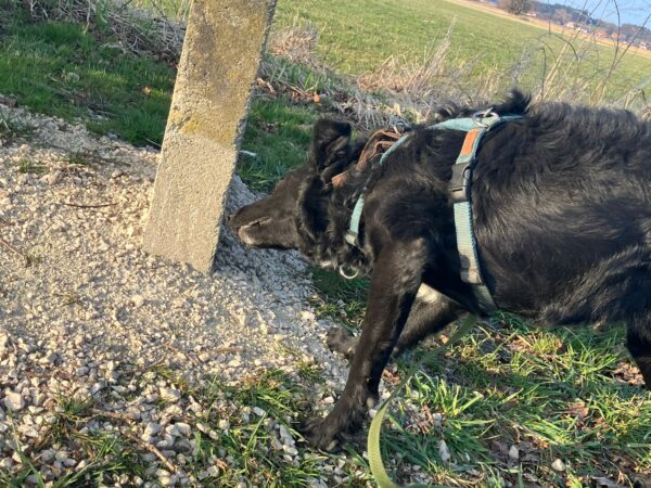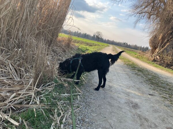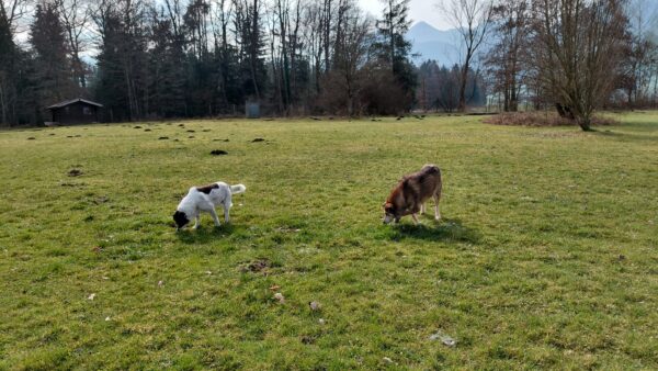 Mit Resi und Franzi ging Elfriede vom Maler Haas aus auf die Wiesen beim Förchensee mit einem Abstecher in den Wald, wo sie vielen interessanten Spuren nachschnupperten und dabei auch die von Elfriede ausgelegten Leckerchen fanden. Franzi wälzte sich noch ausgiebig, dann muste Elfriede zurück zum Auto beinahe joggen, denn es war Fütterungszeit und da hatten es die Mädels eilig. 🙂