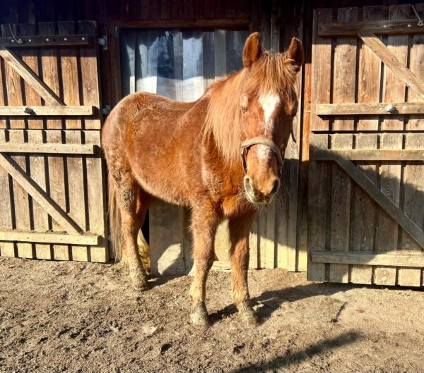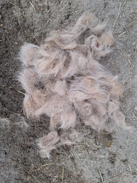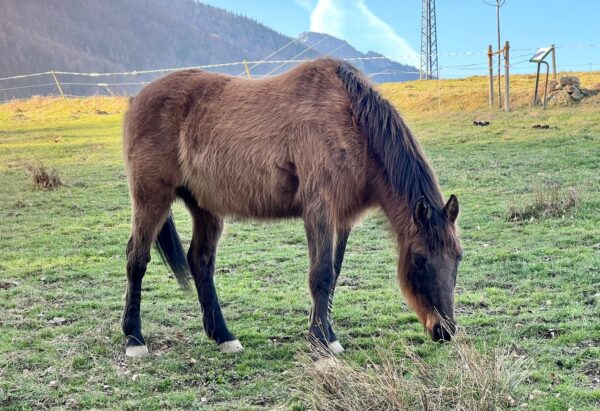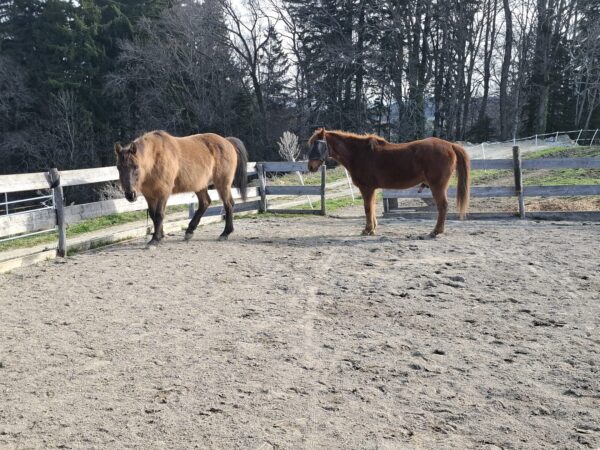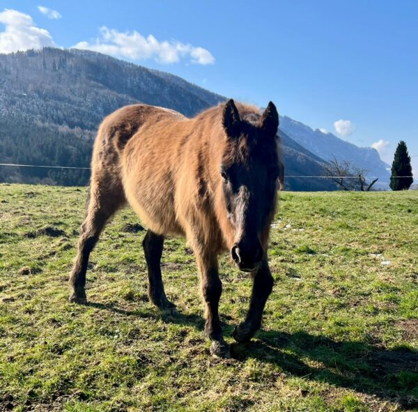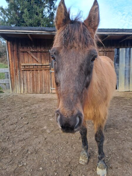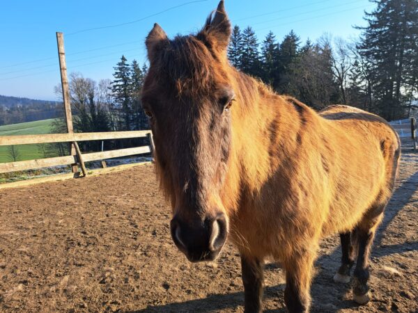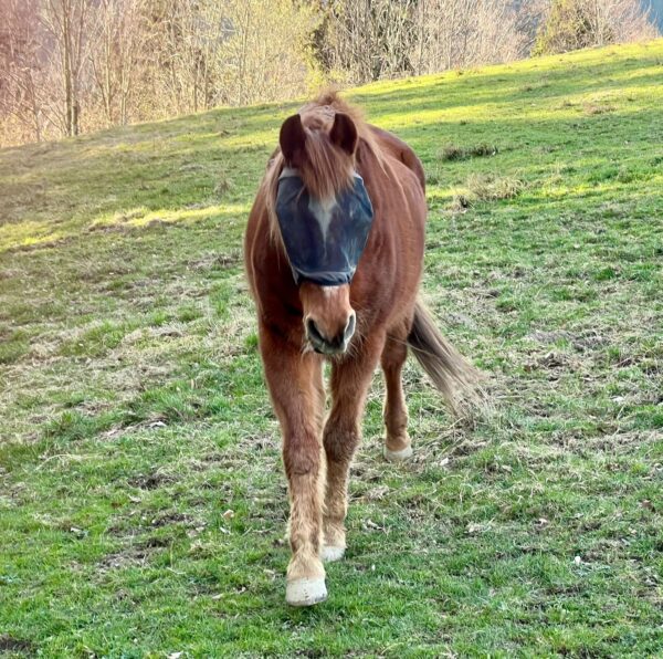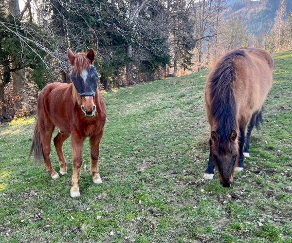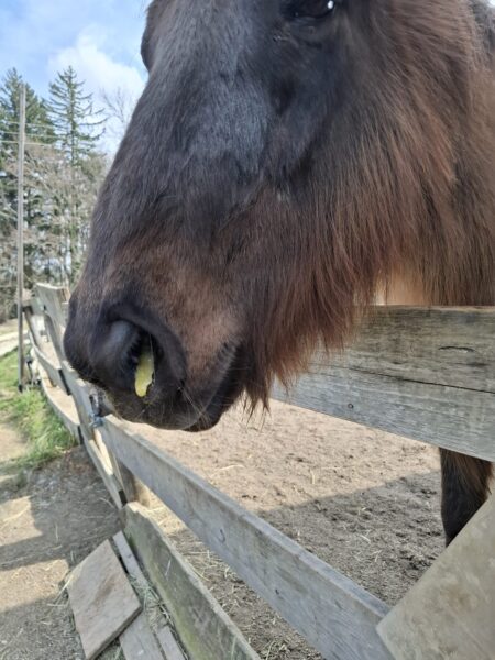 Als Anna Maria am Morgen zum Stall kam, öffnete der Bauer gerade den Zugang zur großen Weide und die beiden galoppierten bestens gelaunt raus. 🙂Da interessierten sie sich gar nicht für das Frühstücksmüsli und Anna Maria begann deshalb mit dem Abmisten, füllte die Heuraufen auf und kontrollierte das Tränkebecken. Anschließend bereitete sie eine kleine Vorspeise vor, indem sie die Tabletten für die Pferde in Bananenstückchen versteckte und auf die Weide ging. So angelockt kam Wallace gleich mit, Gowinda wurde danach abgeholt. Sobald er den Führstrick sah, trottete er an Anna Maria‘s Seite zur Box und mampfte sein Müsli. Offensichtlich hatten sich beide ausgiebig im Schlamm gewälzt, die Fellpflege dauerte etwas länger.🙂 Gowinda ist im Fellwechsel, weshalb danach Unmengen von Haaren am Boden lagen. Wallace genoss sichtlich die Fellpflege, er blieb dabei ganz entspannt stehen. Beide freuten sich, als sie wieder auf die Weide durften und vorher Apfelstückchen von Anna Maria bekamen. 🙂