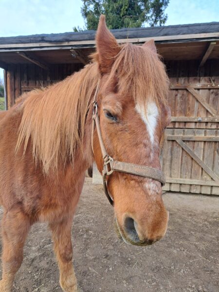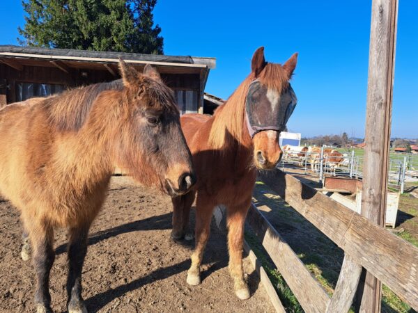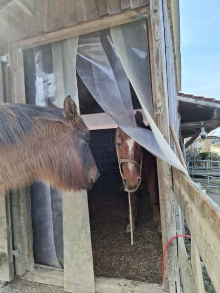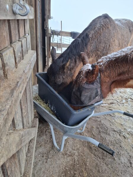 Abends war Carola im Stall, die von Gowinda und Wallace freundlich wiehernd begrüßt wurde. Während die beiden ihr Müsli fraßen, mistete Carola ab, legte frisches Heu nach und kontrollierte die Tränke. Dann kuschelte sie noch einen Moment mit den Jungs, bevor sie sich von ihnen verabschiedete. 🙂