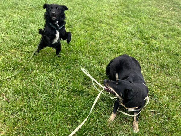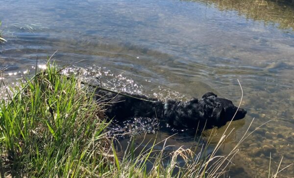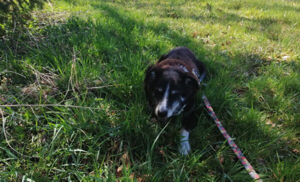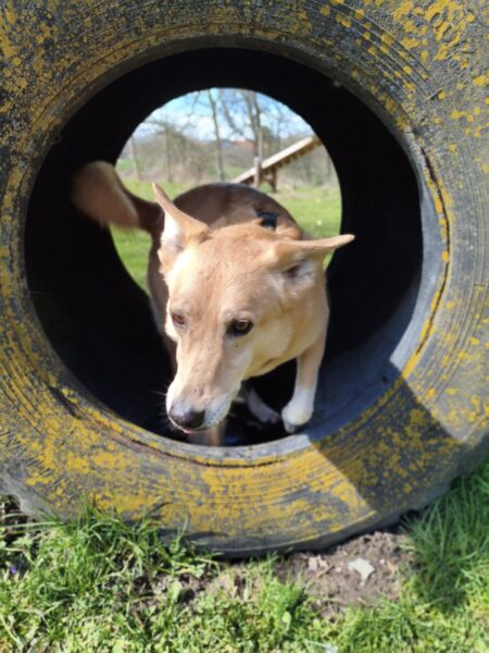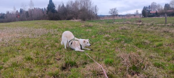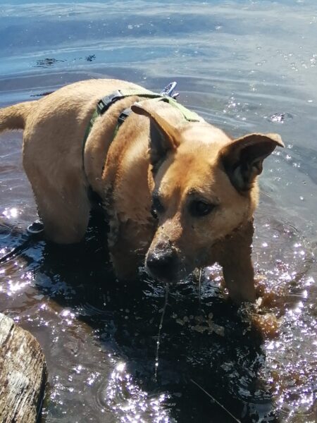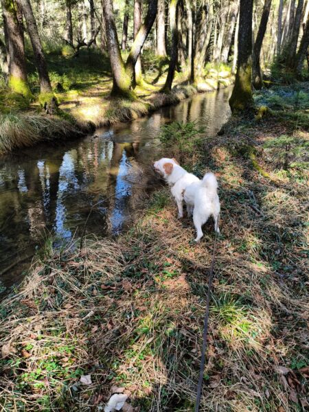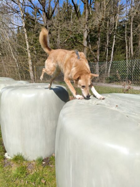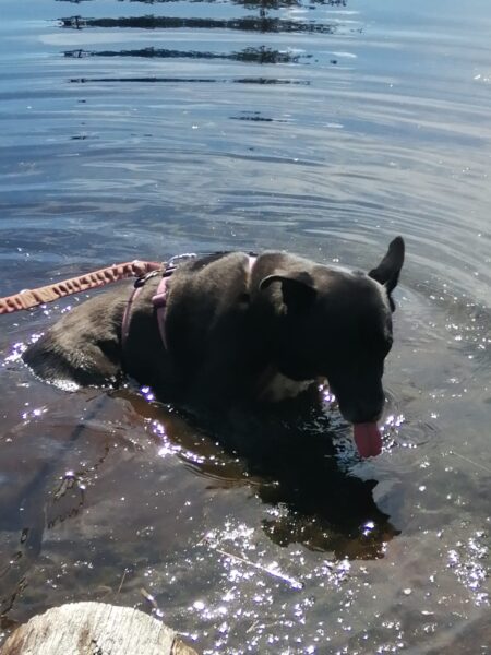 Jeanne und Lucky 2.0 waren zuerst auf dem Hundeplatz, wo Lucky sich fröhlich austobte und danach brav mit Jeanne an den Geräten arbeitete. Anschließend ging er zum Schwimmen in den Bach. 🙂