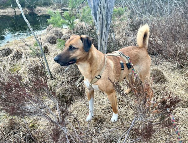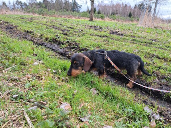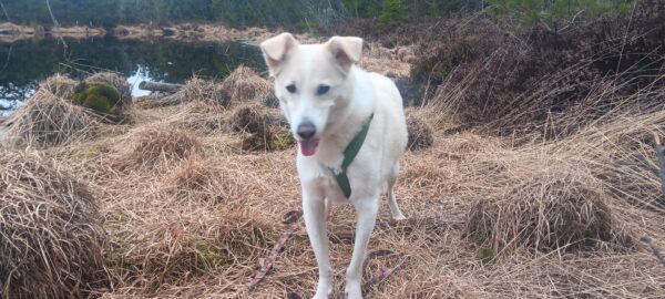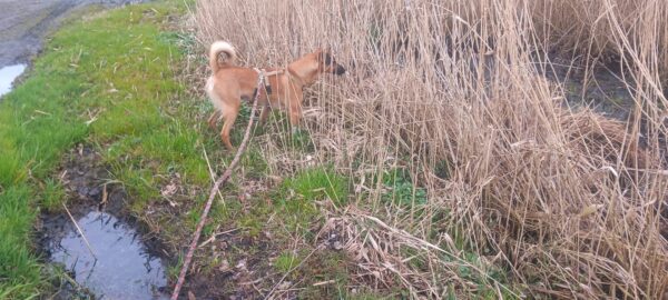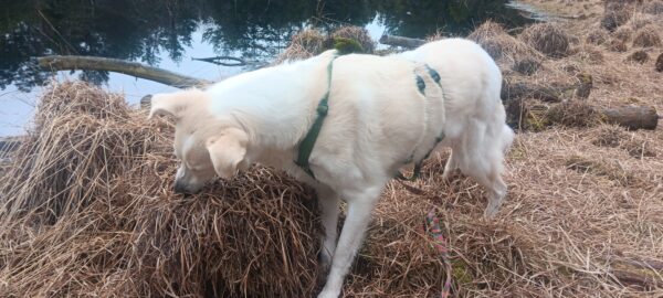 Danach ging Anna Maria mit Sam zur großen Wiese und zum kleinen See dahinter. Sam schnüffelte herum und fand dabei auch die von Anna Maria ausgelegten Leckerchen, die er begeistert einsammelte. Dann erkundete er den Uferbereich und beobachtete ein paar Wasservögel. 🙂