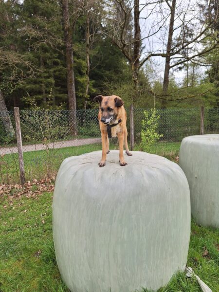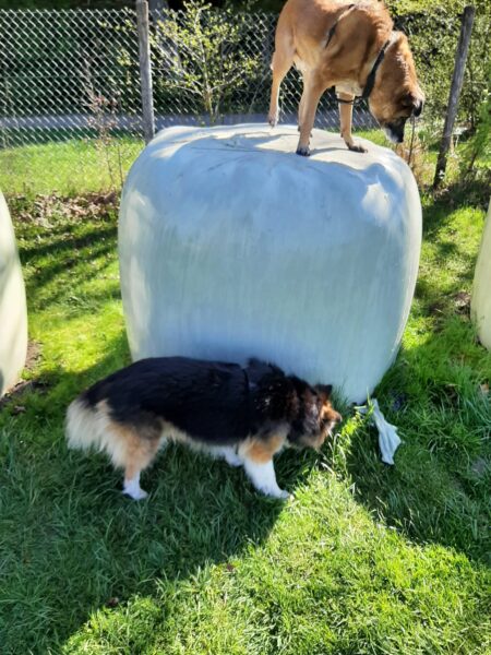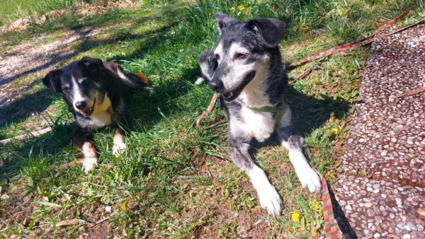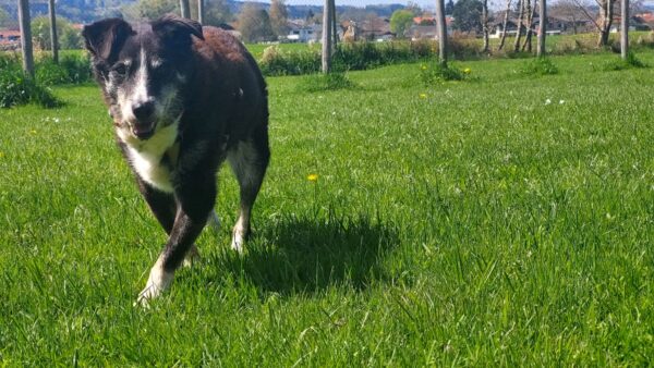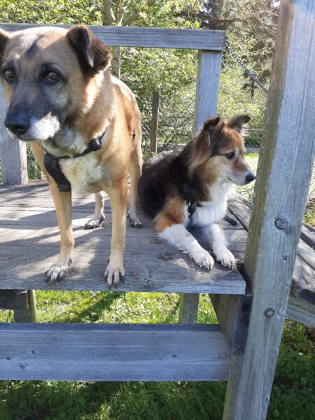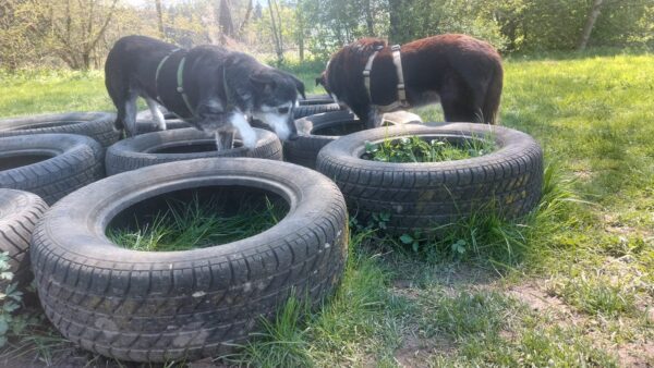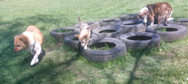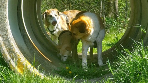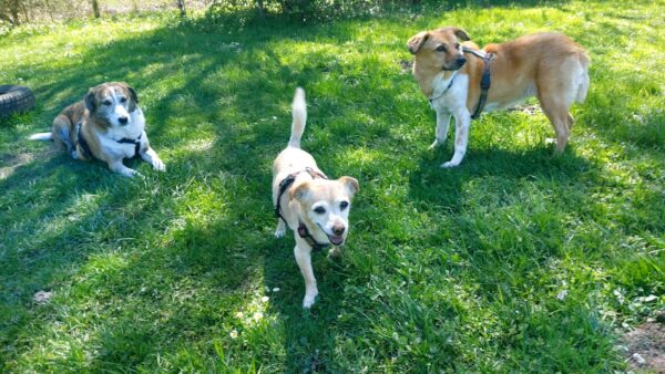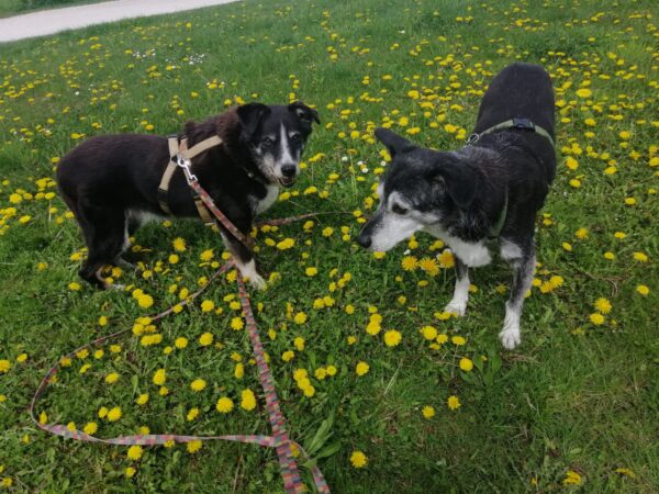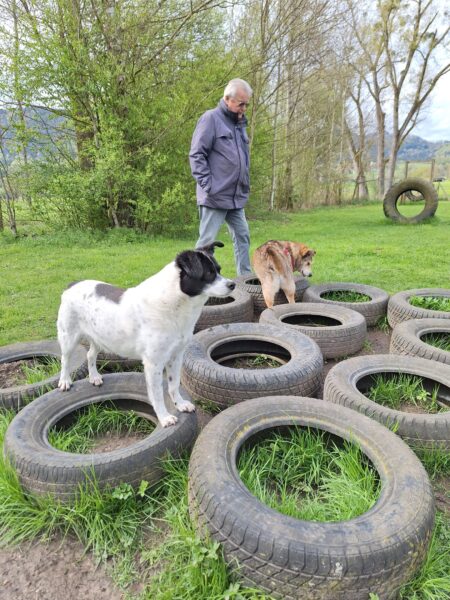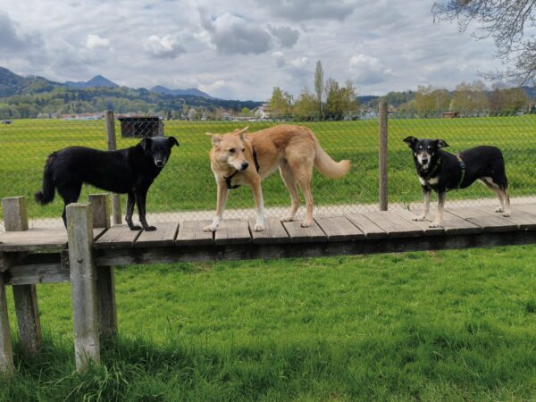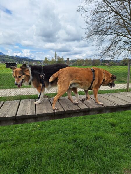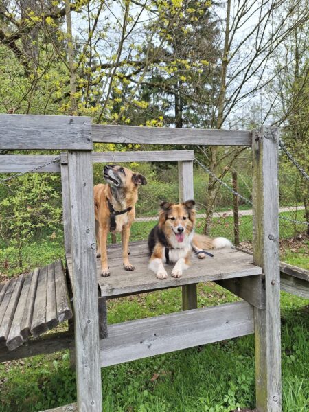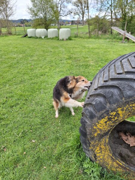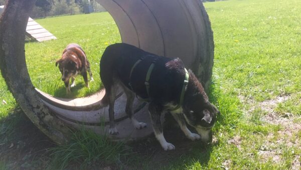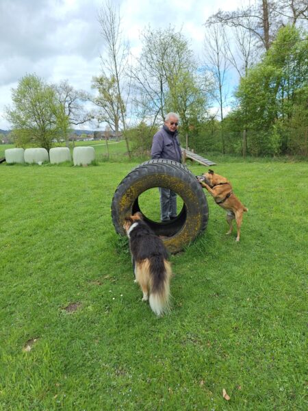 Fio und Flora freuten sich über einen Ausflug mit Jutta zum Hundeplatz. Die beiden sind flott über die Wiese zu den Geräten gelaufen, wobei Flora Jutta immer wieder zum Rennen aufforderte und Fio hat sich gerne seinen dicken Pelz kraulen lassen. Natürlich gab es auch eine Leckerchensuche bei den Reifen und ein paar Wettrennen mit vorbeikommenden Hunden am Zaun. 🙂