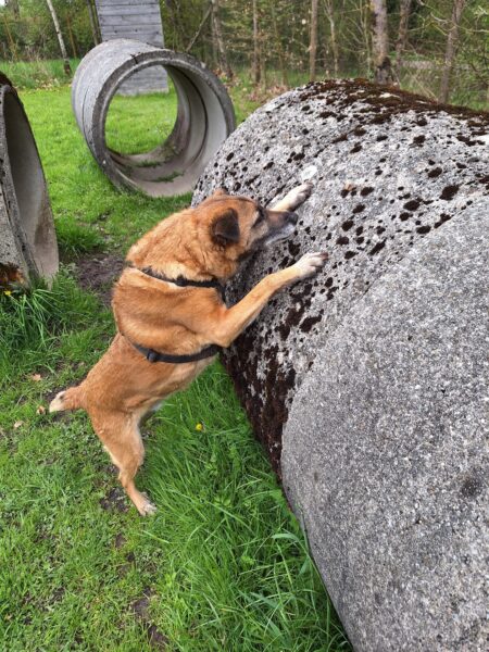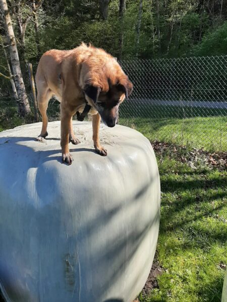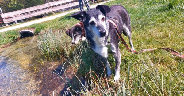 Danach fuhr Conny mit Resi und Franzi zum Hundeplatz, wo die beiden schon länger nicht mehr waren. Als sie ausstiegen und bemerkten, wo sie sind, sausten sie gleich fröhlich herum, schnüffelten und liefen dann schnurstracks zu den Reifen, wo sie sich auf eine Leckerliesuche freuten. 🙂 Danach bummelten sie gemütlich zu den Geräten, Franzi turnte gerne darauf herum und hatte dabei eine tolle Aussicht, Resi verfolgte lieber die spannenden Duftspuren am Boden. Eine Gelegenheit zum Lungenstückchen-Tauchen ergab sich auch noch, Conny funktionierte kurzerhand den Wassernapf um und Resi und Franzi waren glücklich. ❤️