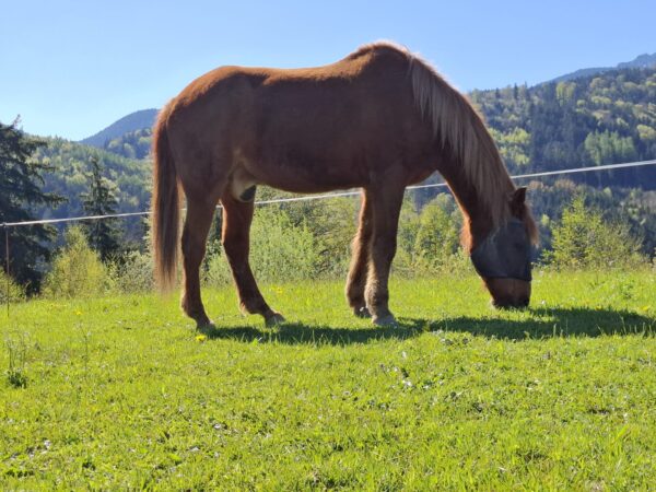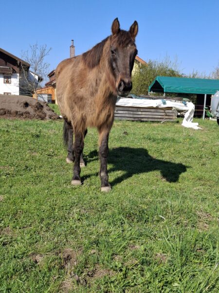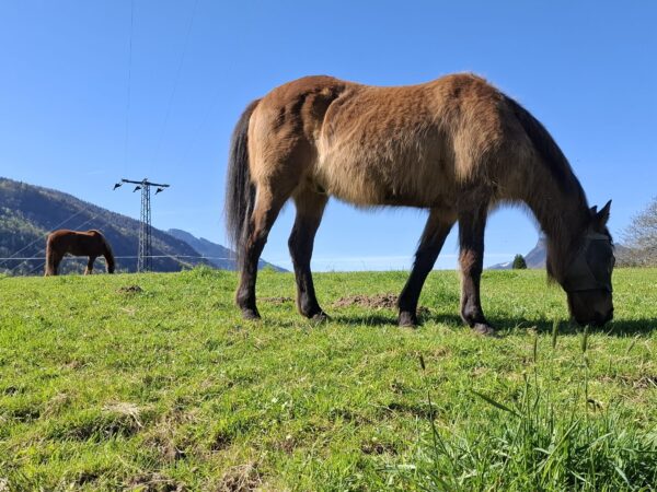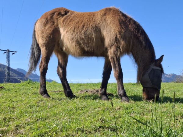 Während der Fell- und Hufpflege von Gowinda kam unten auf dem Weg eine große Wandergruppe vorbei, die von beiden ganz genau beobachtet wurde. Wallace hatte überhaupt keine Lust auf Pflegeprogramm, er wollte auf die Weide. Aber da er mitten im Fellwechsel ist, musste er schon eine Weile mitmachen… aber dann – ab zum Grasen. 🙂