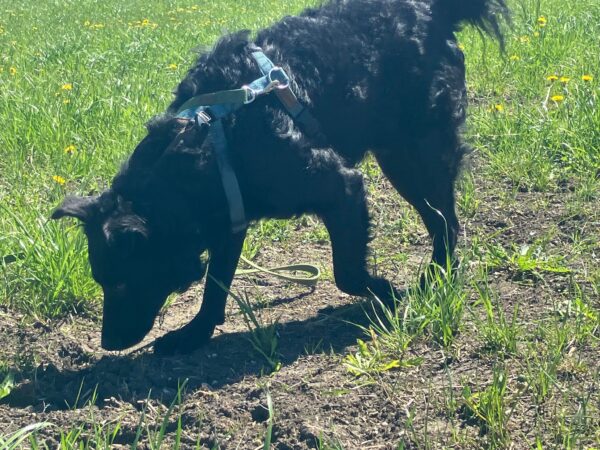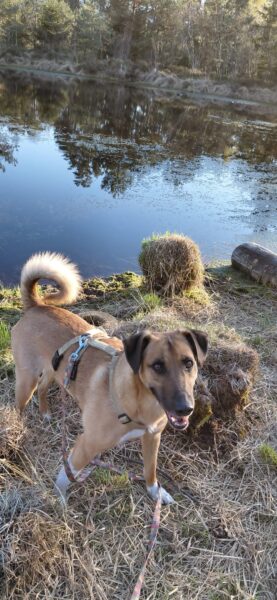 Mit Sam machte Karin einen schönen Abendspaziergang zur großen Wiese und dem kleinen See dahinter. Sam schnüffelte viel, fand dabei die von Karin ausgelegten Leckerchen und kuschelte immer wieder mit ihr. Es war ein schöner Abschluß des Tages. 🙂