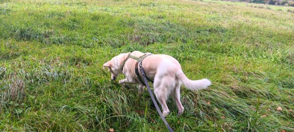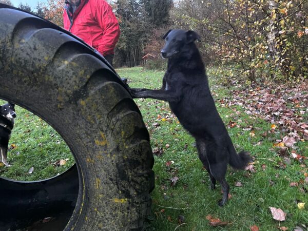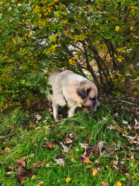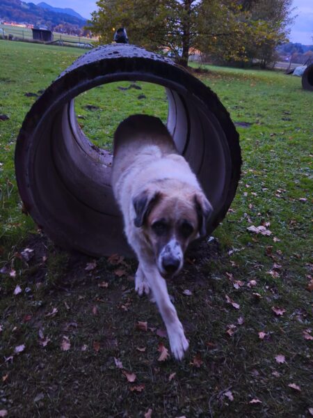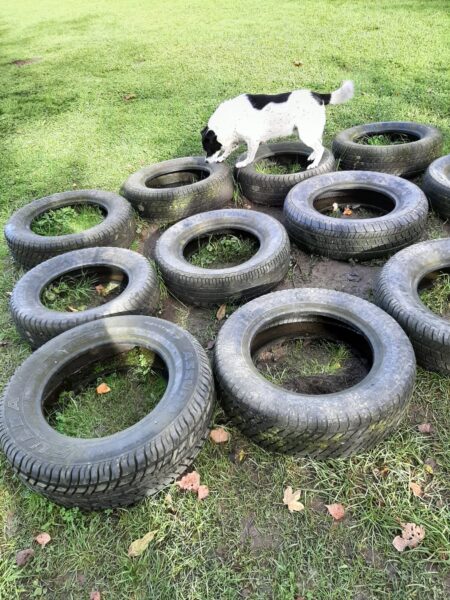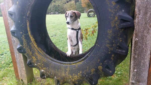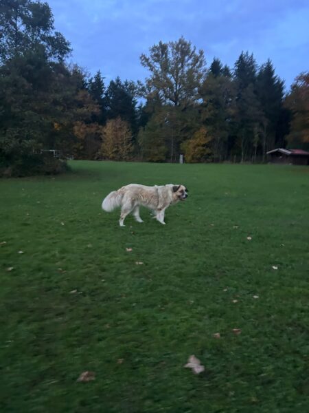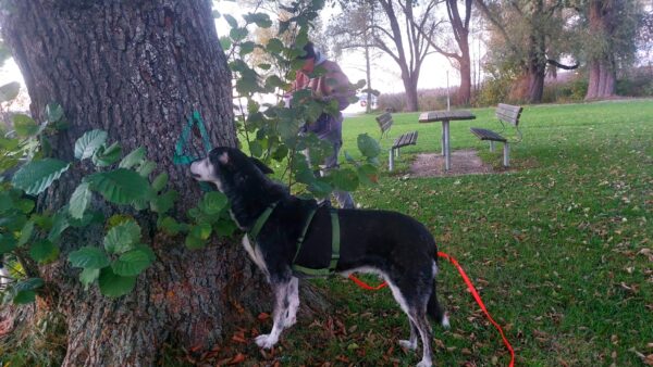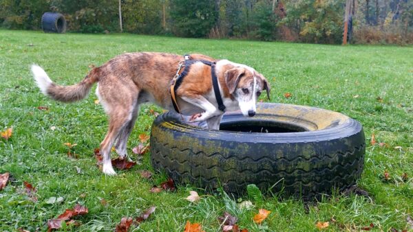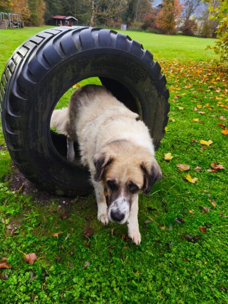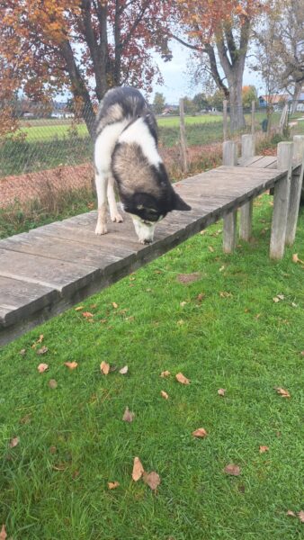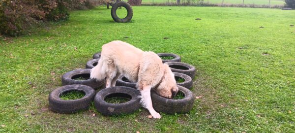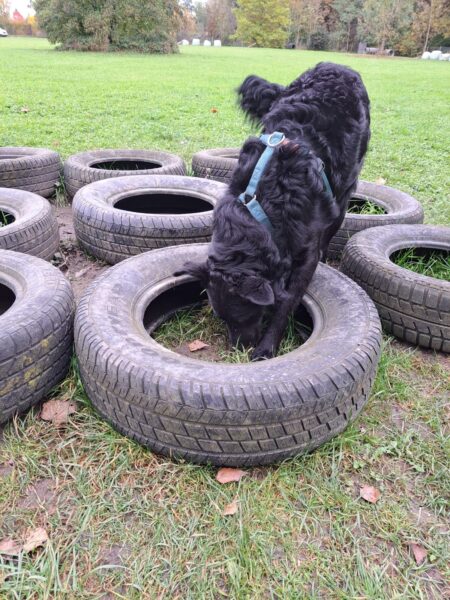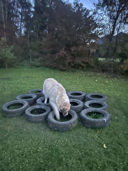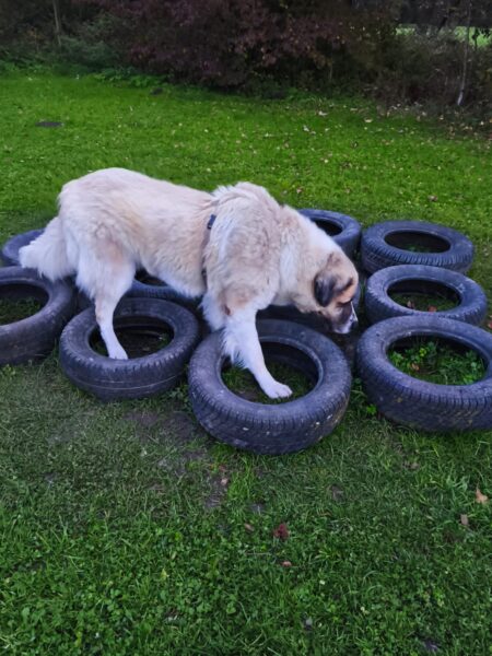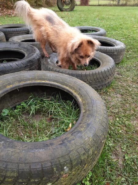 Als Carsten mit Aslan auf dem Hundeplatz war, schnüffelte der in aller Ruhe auf den Spuren der Hunde, die vor ihm hier gewesen waren und freute sich an den Reifen über ausgelegte Leckerchen, die er konzentriert einsammelte. Zwischendrin legte er sich immer mal wieder hin, um sich auszuruhen und die Gegend zu beobachten. Die Nässe machte ihm dabei dank seines dicken Pelzes nichts aus. 🙂
