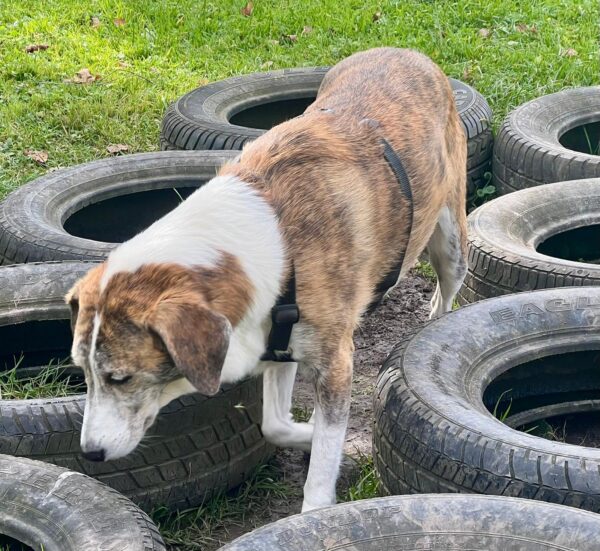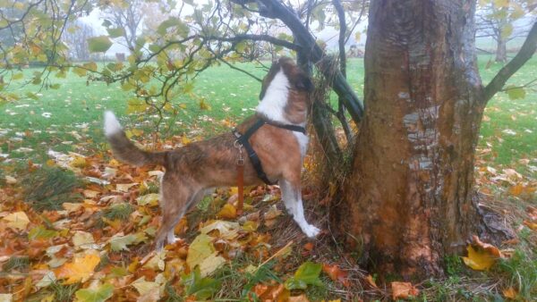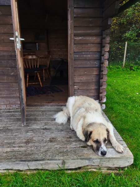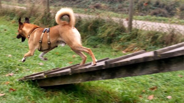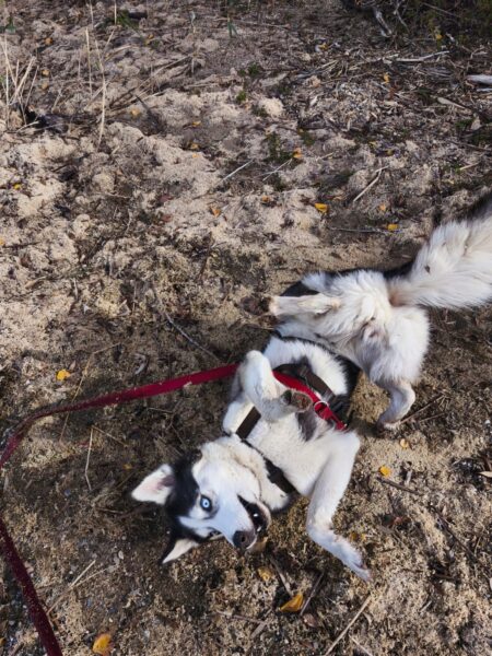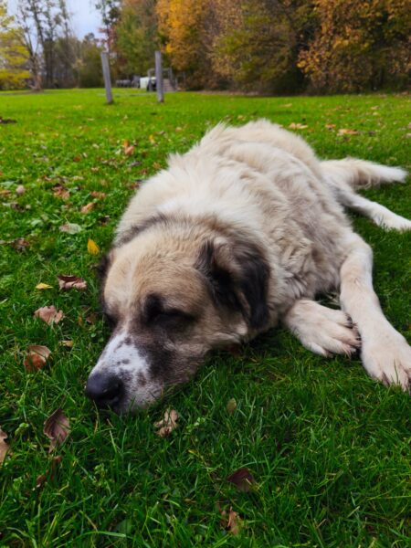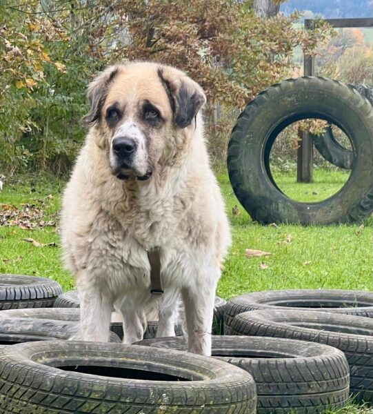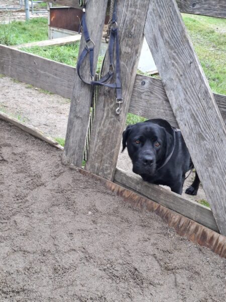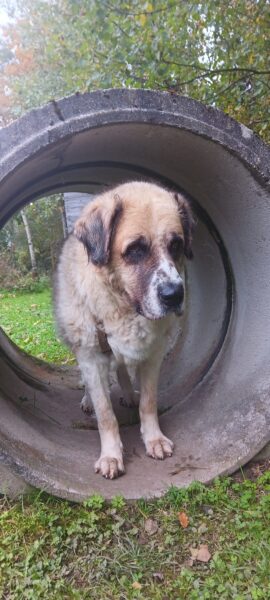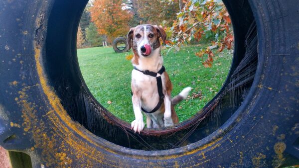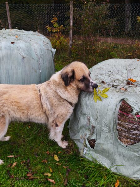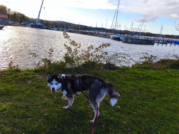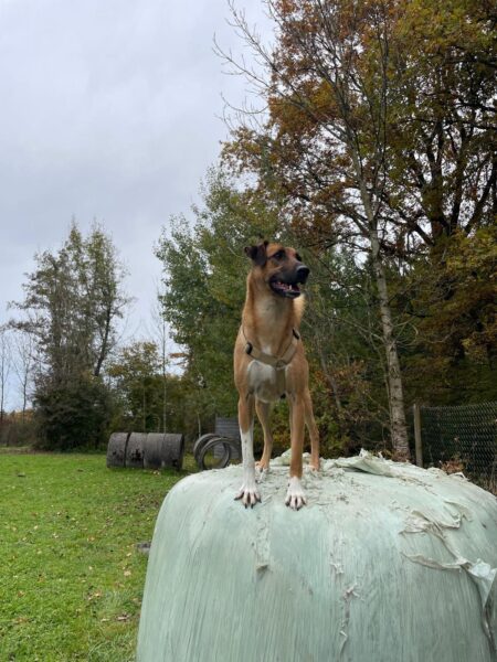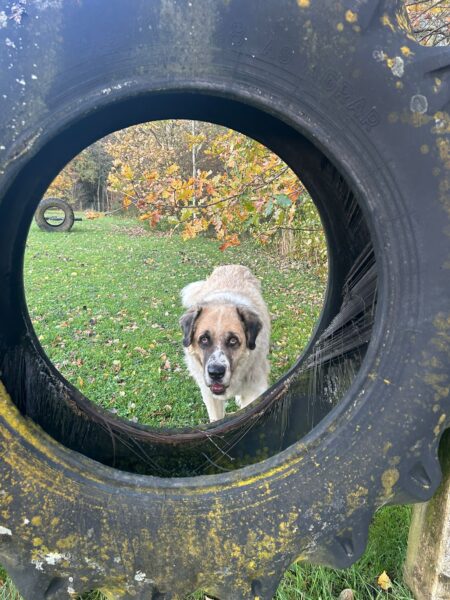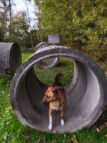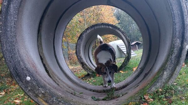 Als Carsten mit Aslan auf dem Hundeplatz war, schnüffelte der in aller Ruhe auf den Spuren der Hunde, die vor ihm hier gewesen waren und freute sich an den Reifen über ausgelegte Leckerchen, die er konzentriert einsammelte. Zwischendrin legte er sich immer mal wieder hin, um sich auszuruhen und die Gegend zu beobachten. Die Nässe machte ihm dabei dank seines dicken Pelzes nichts aus. 🙂