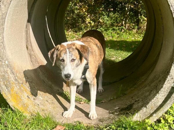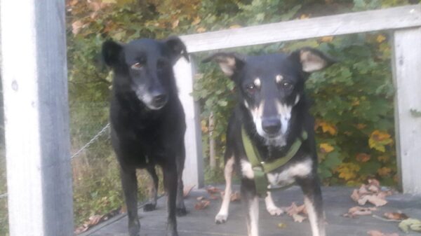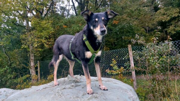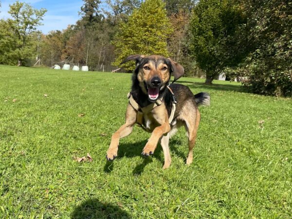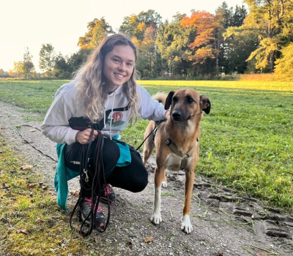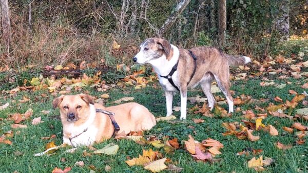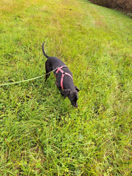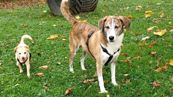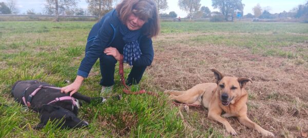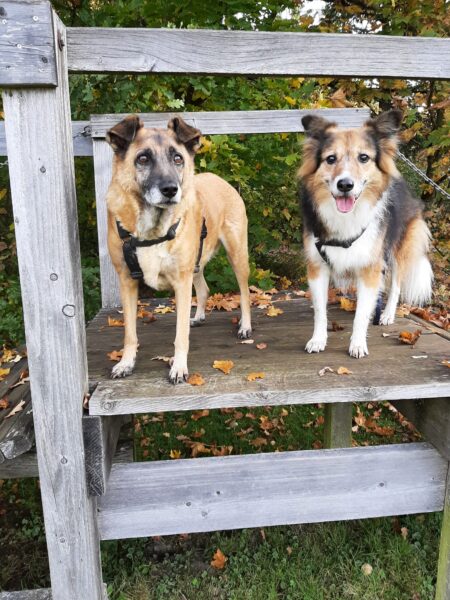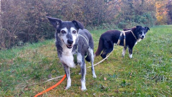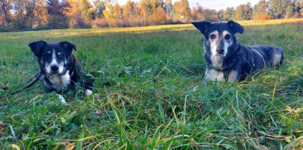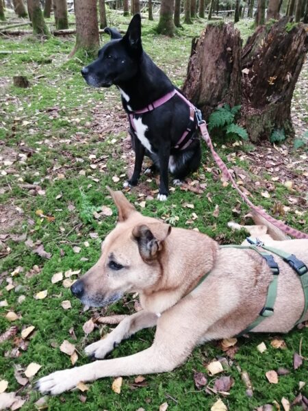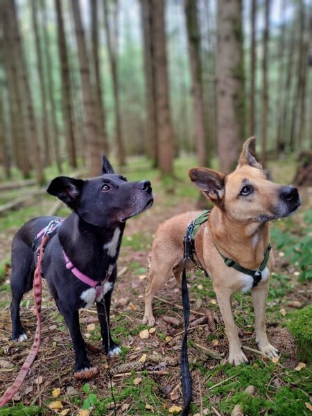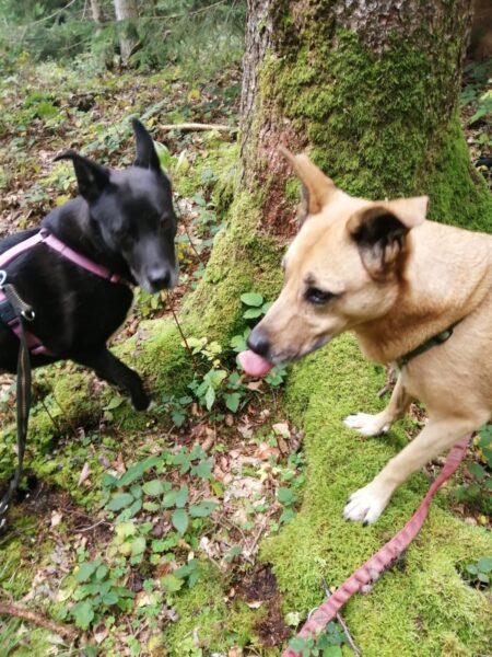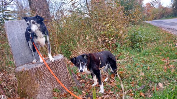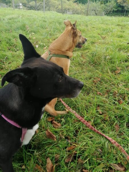 Mit Jack gingen Pam und Dani gemeinsam mit Pam`s Hündin Ronja das erste Mal direkt vom TierHeim aus spazieren. Jack machte das super, er orientierte sich viel an Ronja. Auf der großen Wiese schnüffelte er interessiert alles ab und knabberte sogar entspannt an ein paar Grashalmen. 🙂
