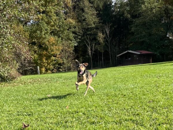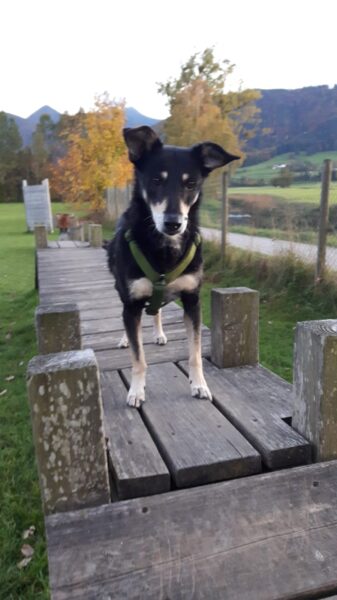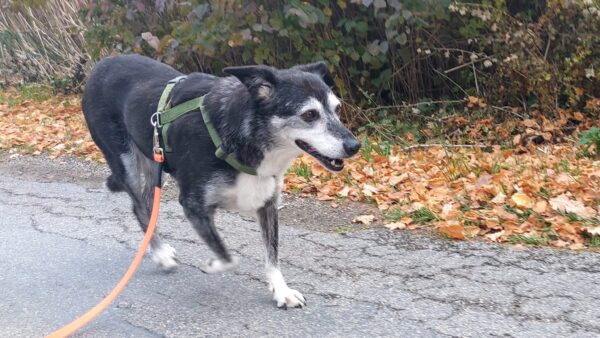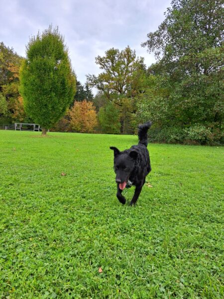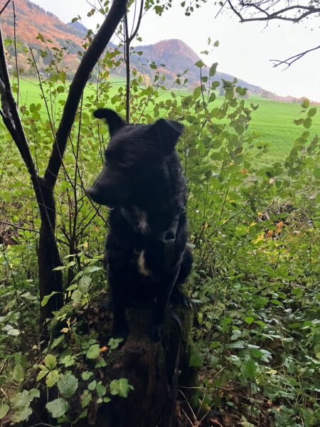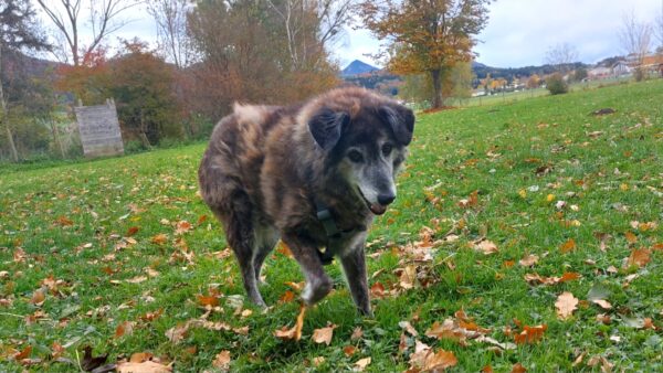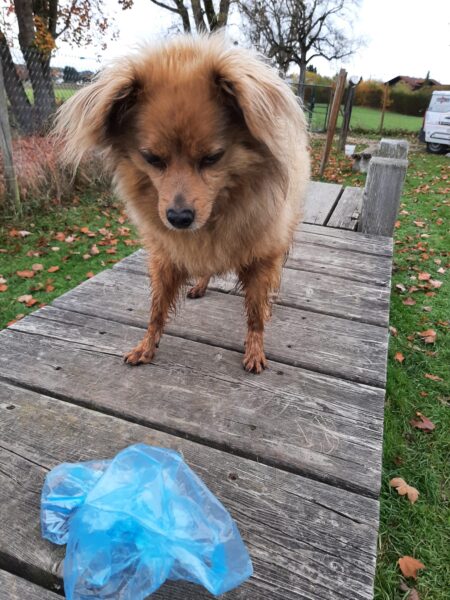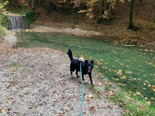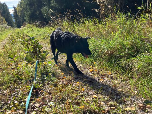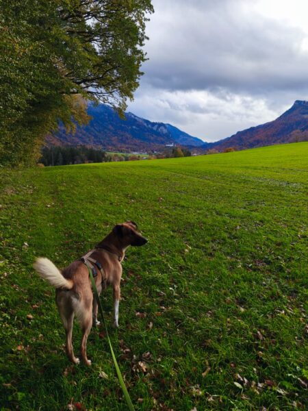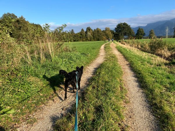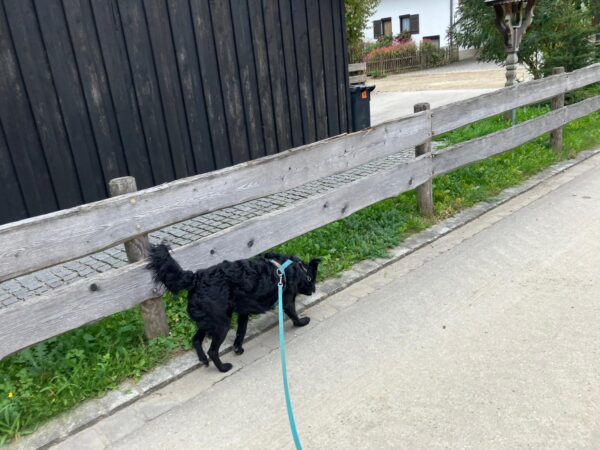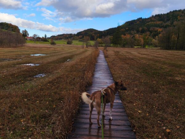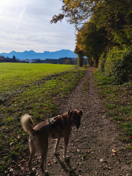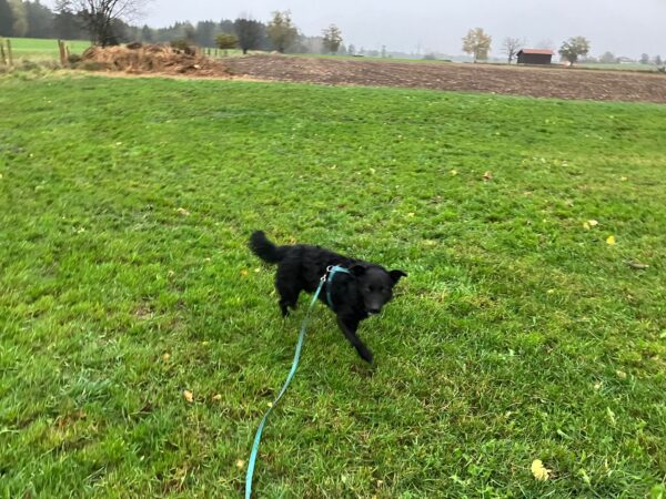 Etwas später kam Jeanne und machte mit Lucky einen Spaziergang zwischen Rottau und Grassau. Obwohl es immer mal wieder regnete, war Lucky in Bestlaune, schnüffelte viel herum, freute sich über Leckerchen und hat Kunststücke vorgeführt. 🙂