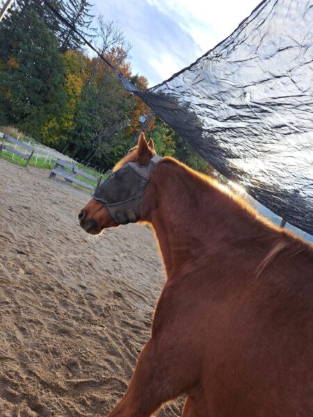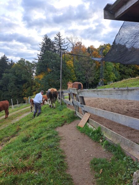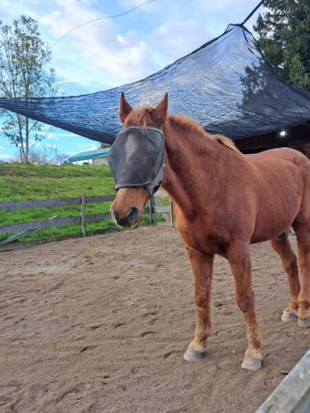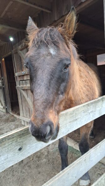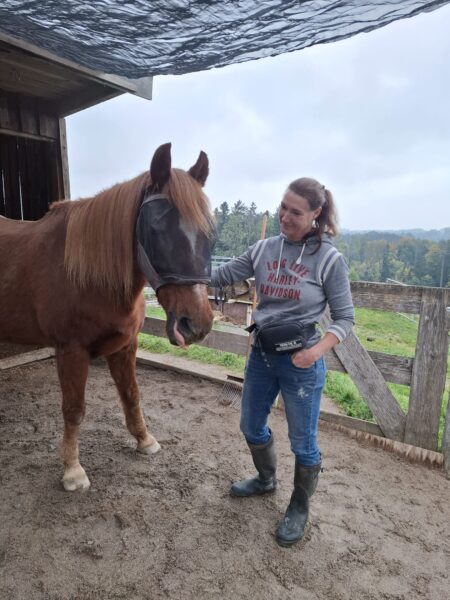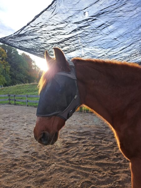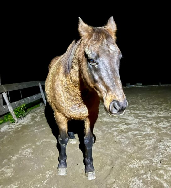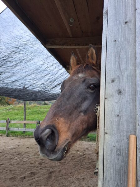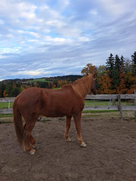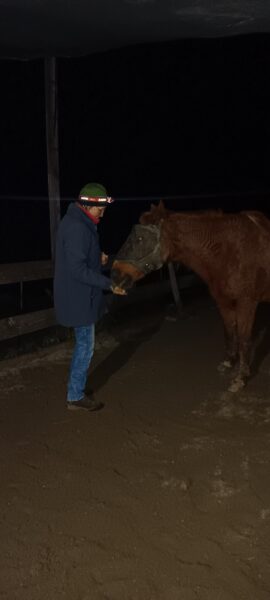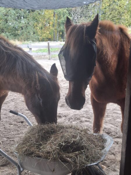 Abends war Anna Maria im Stall und versorgte Wallace und Gowinda, die bei strömendem Regen in ihren Boxen standen. Sie freuten sich über ihr Müsli und frisch aufgelegtes Heu, an dem sie knabberten, als Anna Maria wieder fuhr. Vorher hat sie aber noch mit ihnen gekuschelt und ihnen eine gute Nacht gewünscht. 🙂