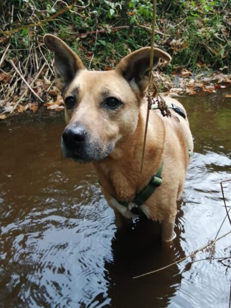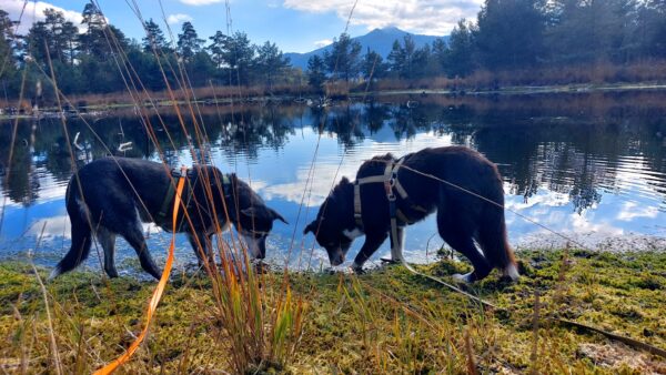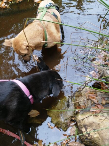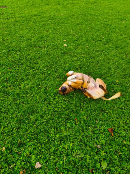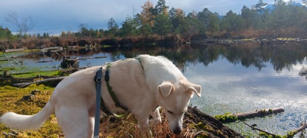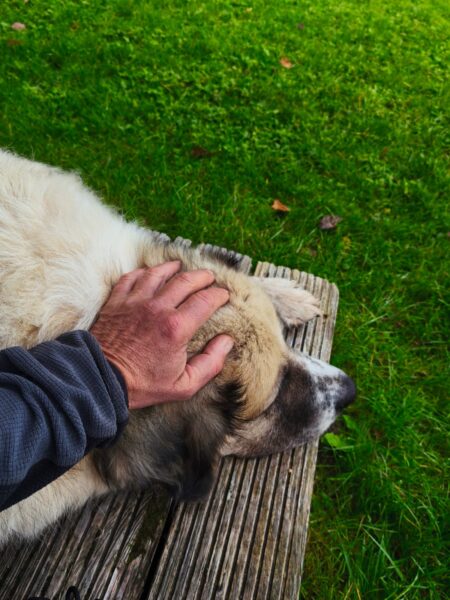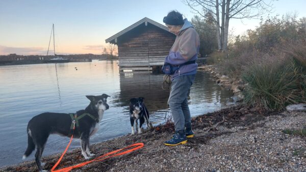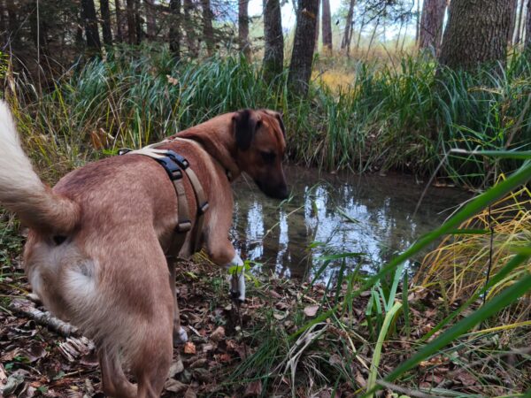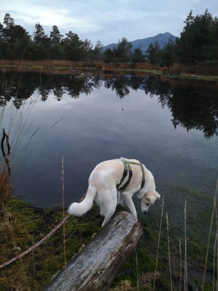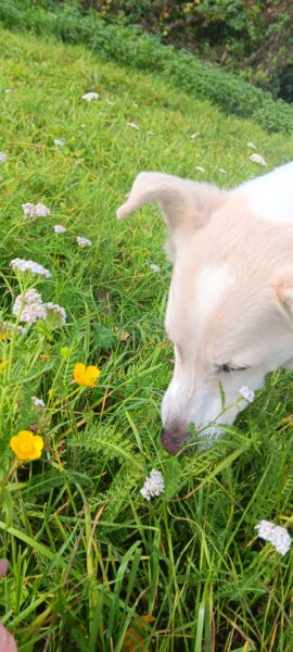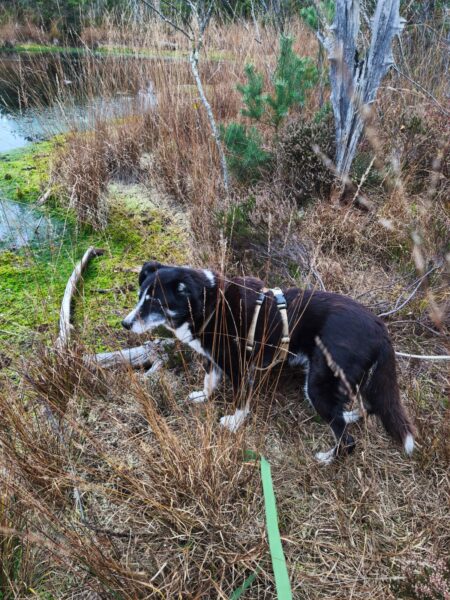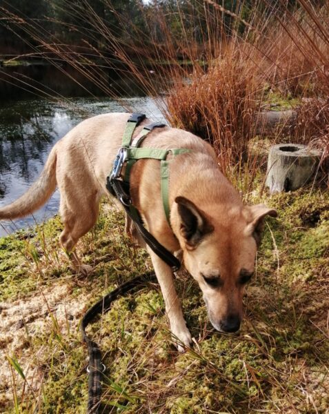 Danach ging Dani mit Santana auf die große Wiese und zum kleinen See dahinter, den Santana heute ganz genau erkundete. Zwischendurch versteckte Dani ihm ein paar Leckerchen, die er fröhlich einsammelte. Danach kuschelte sich Santana während einer Pause an Dani und freute sich über Streicheleinheiten. 😀