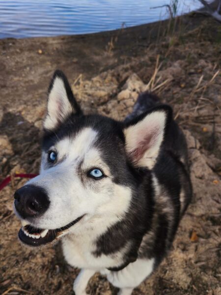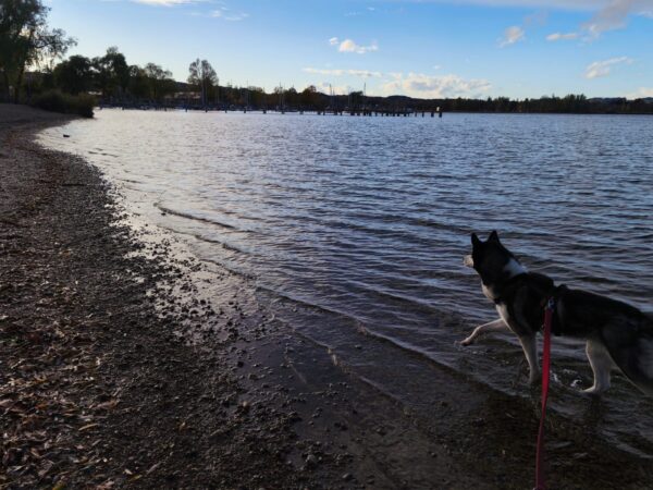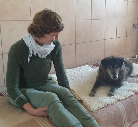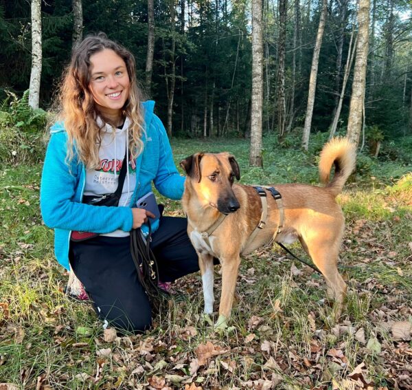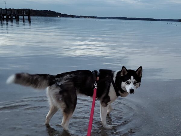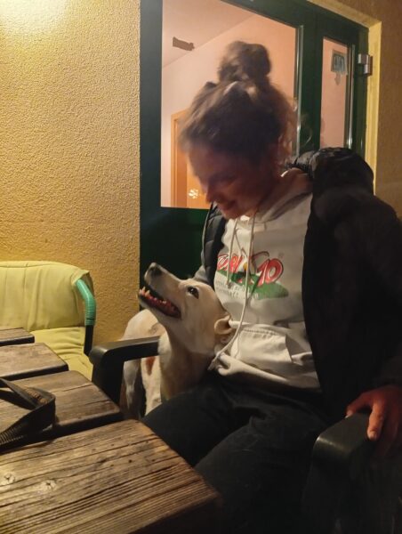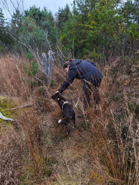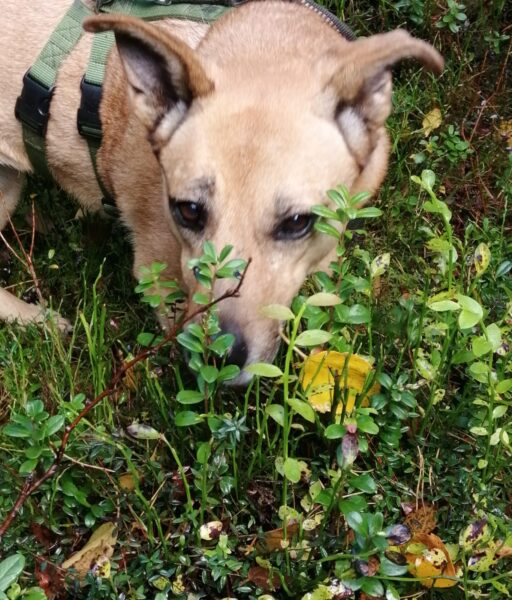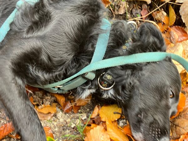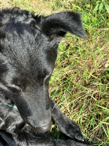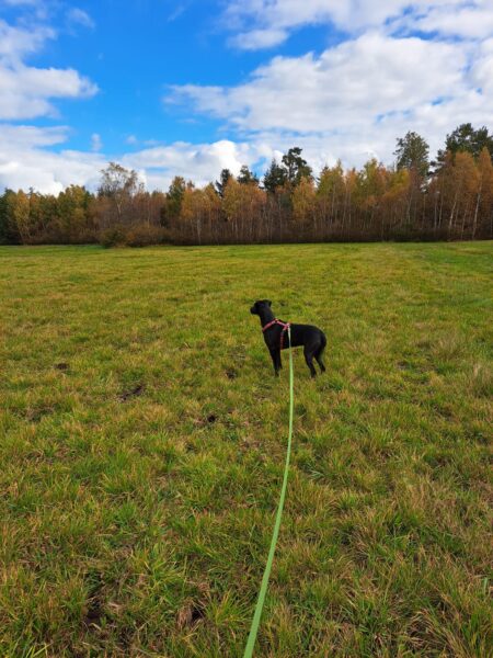 Danach ging Dani mit Santana auf die große Wiese und zum kleinen See dahinter, den Santana heute ganz genau erkundete. Zwischendurch versteckte Dani ihm ein paar Leckerchen, die er fröhlich einsammelte. Danach kuschelte sich Santana während einer Pause an Dani und freute sich über Streicheleinheiten. 😀