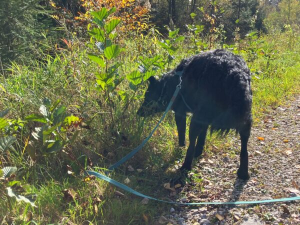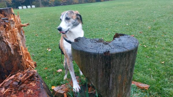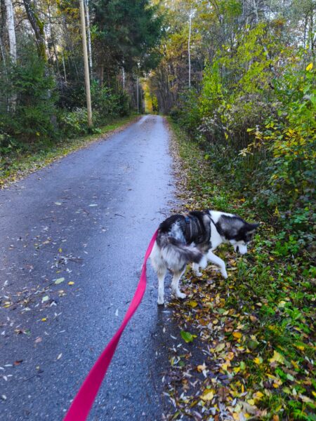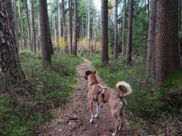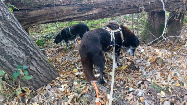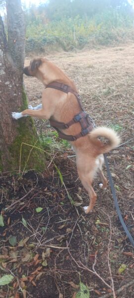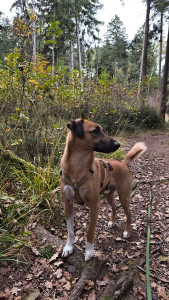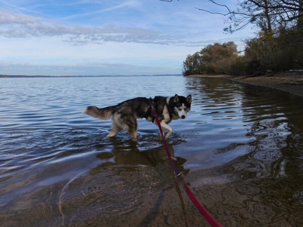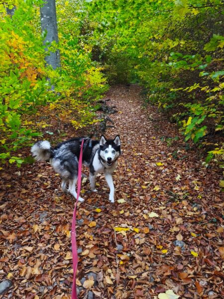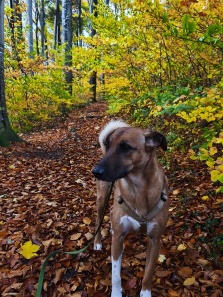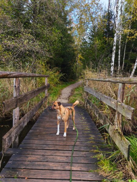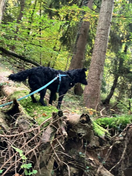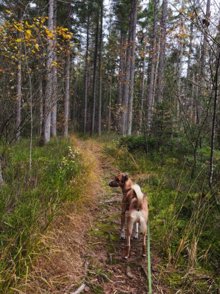 Danach ging Dani mit Sam in Richtung Übersee zum Waldweg. Sam lief super an der Leine, schnüffelte viel am Wegesrand und war sehr gut gelaunt. Besonders die Würstchenbäume, die Dani für ihn präparierte, fand Sam mega klasse! 😀