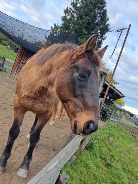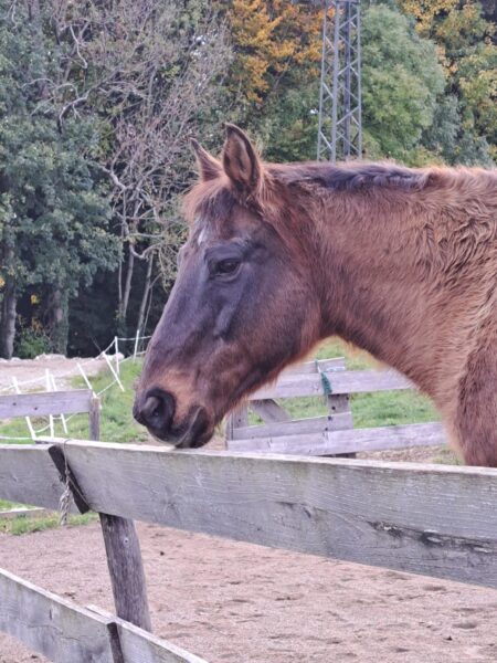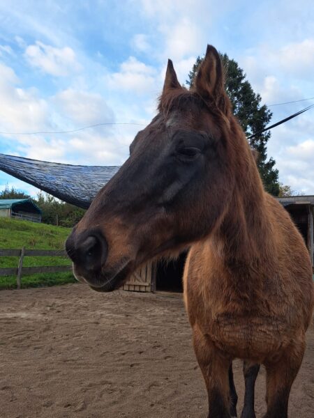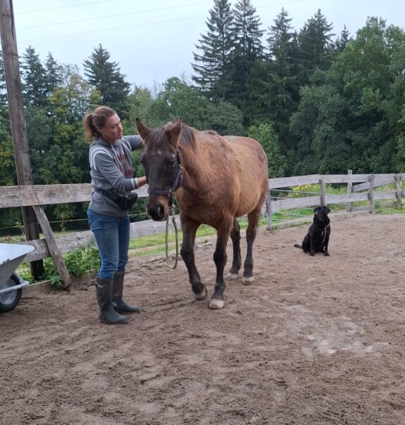 Morgens war Pam bei den Pferden, die sie gleich freundlich wiehernd auf dem Paddock begrüßten. Während die beiden ihr Müsli fraßen, mistete Pam aus, kontrollierte die Tränke und füllte frisches Heu nach. Danach war Fell- und Hufpflege angesagt. Leider geht es mit Wallace Gangbild nur minimal besser…