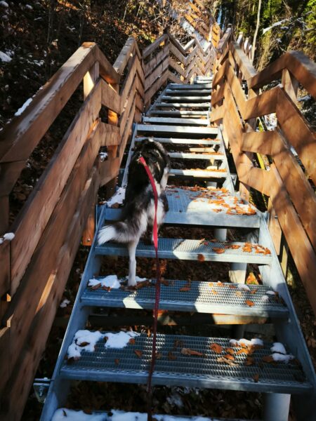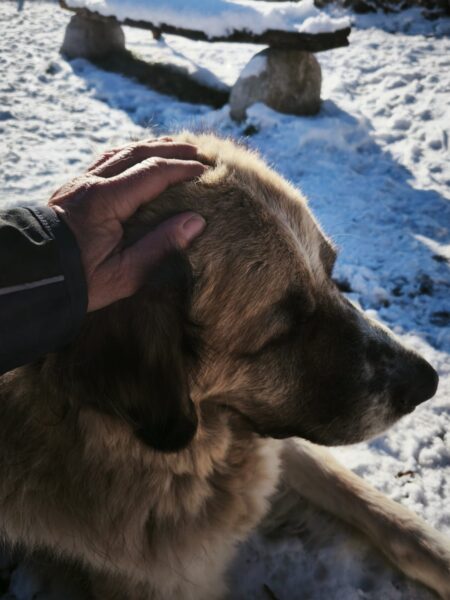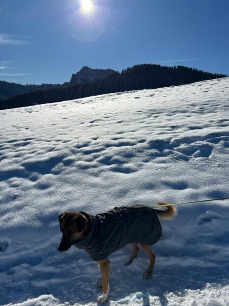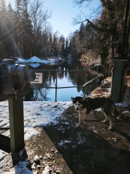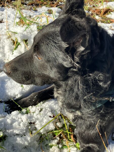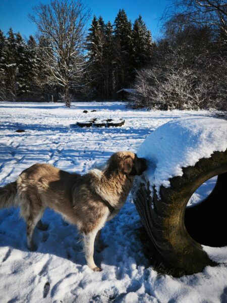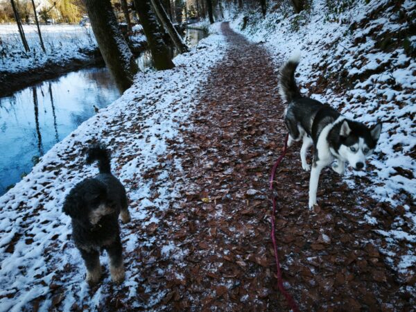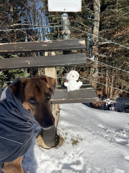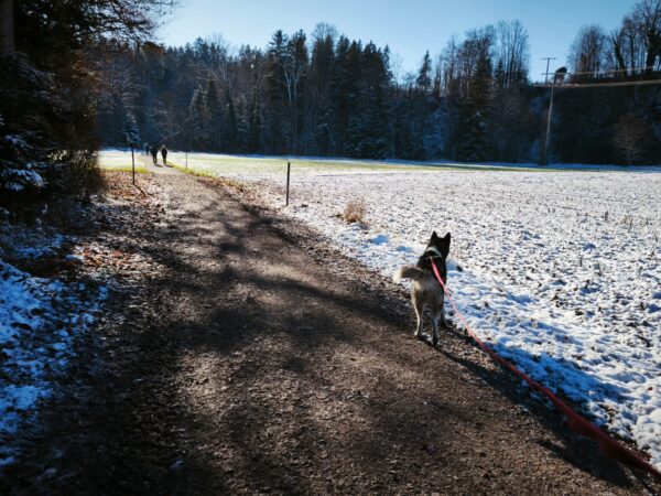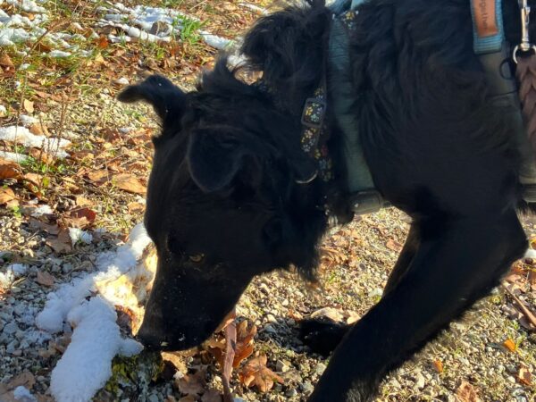 Lucky 2.0 und Jeanne machten einen entspannten Spaziergang auf dem Waldweg bis zur JVA Schranke. Lucky ist inzwischen richtig gut und aufmerksam beim Leckerlies suchen und genoss immer wieder kurze Pausen, in denen er sich mit seinem dicken Fell richtig gerne in den Schnee legte und streicheln ließ. 🙂