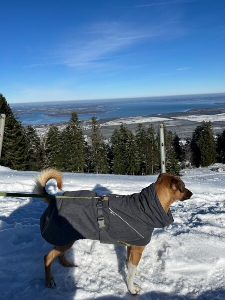 Sylvia und ihr Mann Manfred holten Sam zu einem schönen Ausflug ab. Er begrüßte die beiden freundlich im Hof, aber in ihren VW- Bus wollte Sam nicht einsteigen. Alex öffnete ihr Auto, das Sam ja schon lange kennt, nach kurzem Zögern sprang er hinein und sie konnten losfahren zum Adersberg. Sam war super brav, lief gut an der Leine und schnüffelte neugierig auf dem Weg entlang. Zwischendurch beobachteten alle drei die Umgebung, in der Sonne war die Aussicht und der glitzernde Schnee einfach toll. 🙂