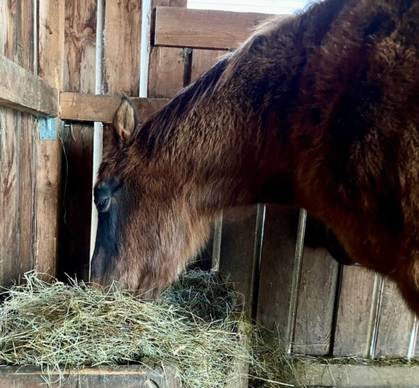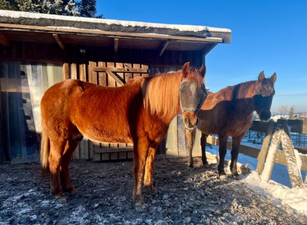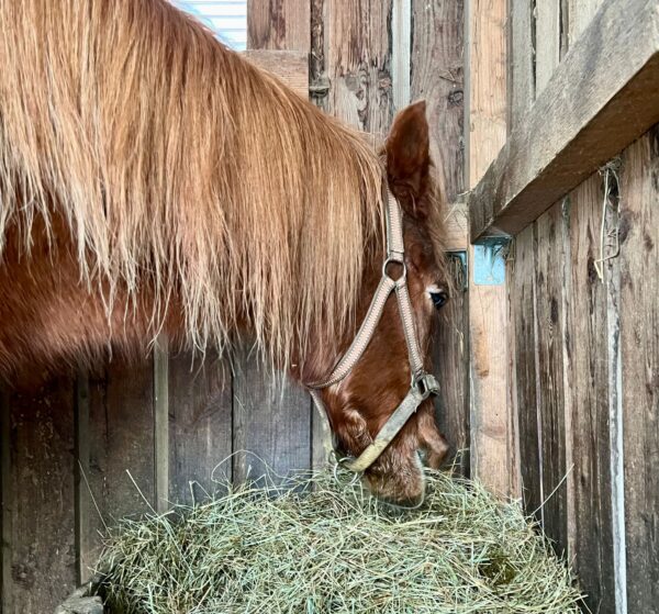Als Anna Maria morgens bei Sonnenaufgang zu den Pferden kam, warteten die schon auf ihr Müsli. Während sie fraßen, erledigte Anna Maria die Stallarbeiten und legte frisches Heu auf. Fellpflege war heute kaum erforderlich, beide waren recht sauber. Als sich Anna Maria mit dem Bauern unterhielt, erwähnte der, dass sie sich gestern begeistert im Schnee kugelten. 🙂 Nachdem die Hufe ausgekratzt waren, gingen sie wieder in die Boxen und knabberten am Heu.