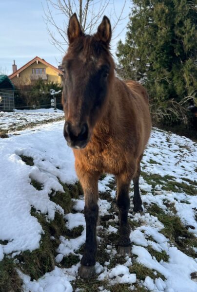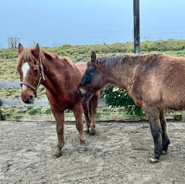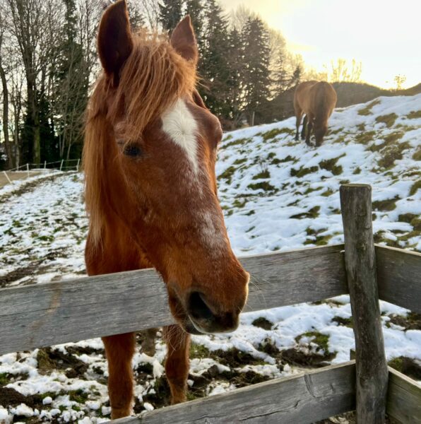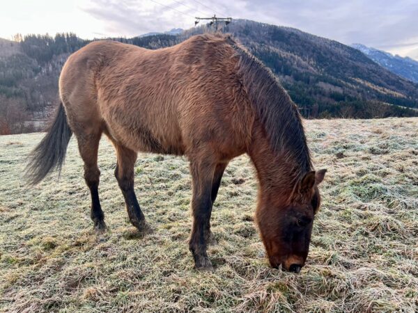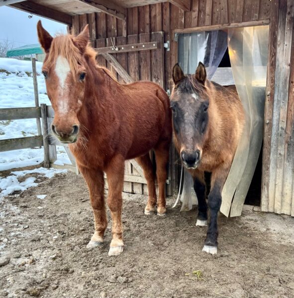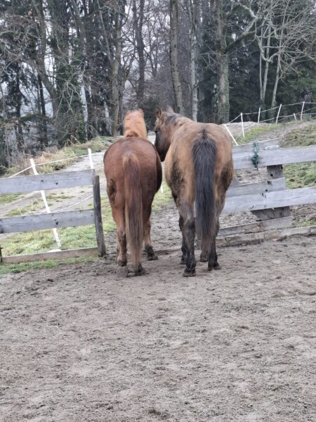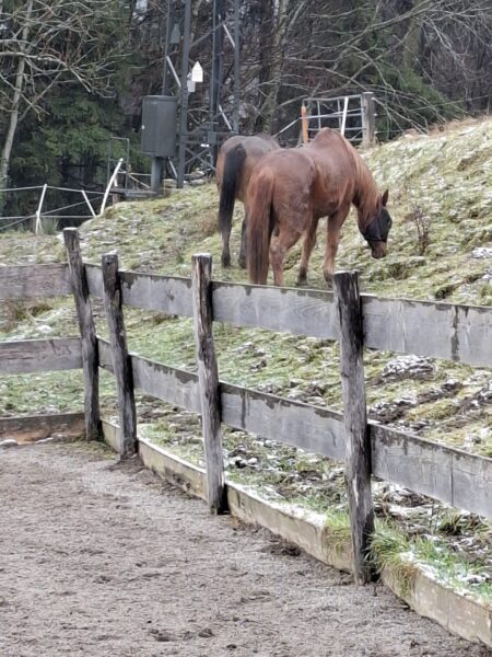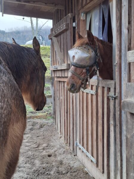 Am Morgen fuhr Anna Maria zu Wallace und Gowinda, die sie wiehernd begrüßten und versorgte sie mit ihrem Frühstück. Danach putzte sie beide und kratzte ihnen die Hufe aus. Bei Gowinda war sogar der Kopf ziemlich mit Schlamm bedeckt, geduldig ließ er sich von Anna Maria sauber machen, obwohl er es nicht so toll fand. Nach der medizinischen Versorgung von Wallace gab es frisches Heu, an dem die Jungs knabberten, als Anna Maria wieder fuhr. 🙂