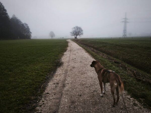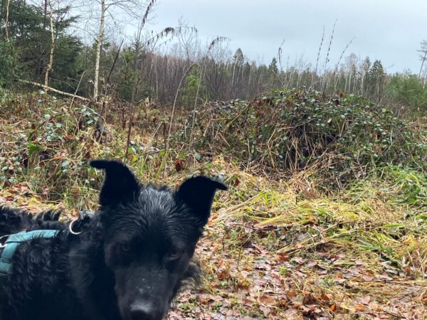 Jeanne ging mit Lucky 2.0 in Richtung Übersee und dann den Waldweg hoch bis zur Schranke der JVA. Lucky schnüffelte begeistert herum, freute sich über Leckerchen und hatte viel Spaß daran, im feuchten Gestrüpp herumzuschnurgeln. Der Regen war ihm ganz egal, Hauptsache alles roch alles gut! 🙂