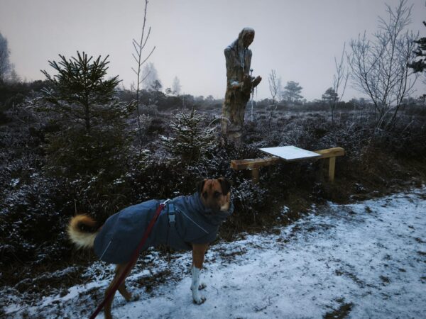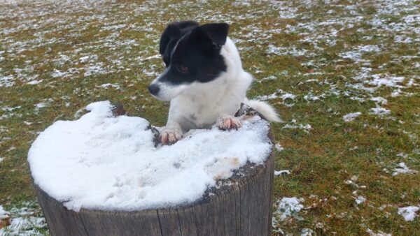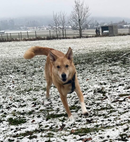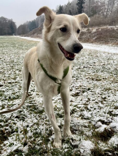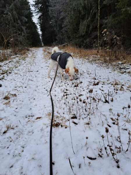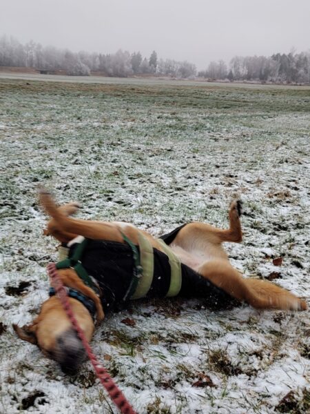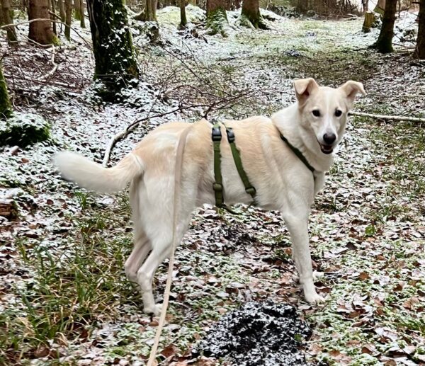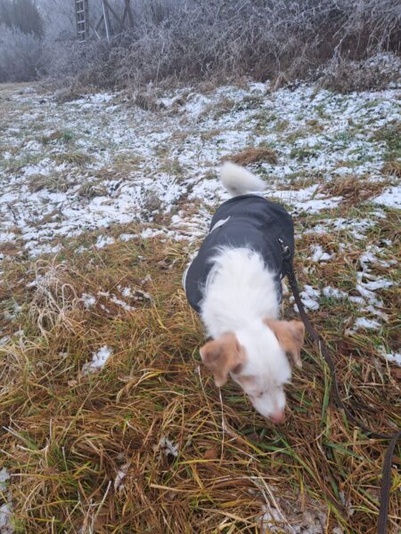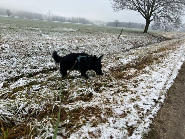 Biggi war mit Elfie auf der großen Wiese, wo Elfie sie erwartungsvoll anschaute – sie wollte Leckerchen suchen. 🙂 Also legte Biggi ihr welche aus, die Elfie mit großer Sorgfalt und viel Freude einsammelte. Danach liefen die beiden noch ein Stück, bevor es zurück ins Warme ging. 🙂
